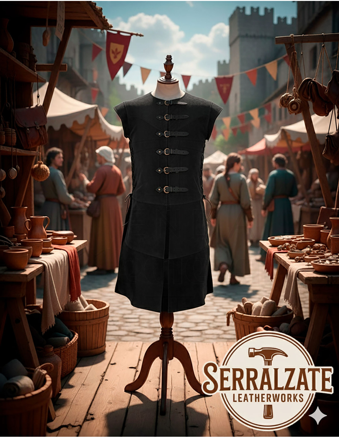 Elk detail, van de zichtbare naden tot de gestructureerde panelen aan de onderkant, is ontworpen voor duurzaamheid en een elegante pasvorm. Zoals alle producten van Serralzate LeatherWorks onderscheidt de Baldomero tuniek zich door zijn onderscheidende ontwerp en aandacht voor detail, en is het een onmisbaar kledingstuk voor elke liefhebber van middeleeuwse esthetiek.