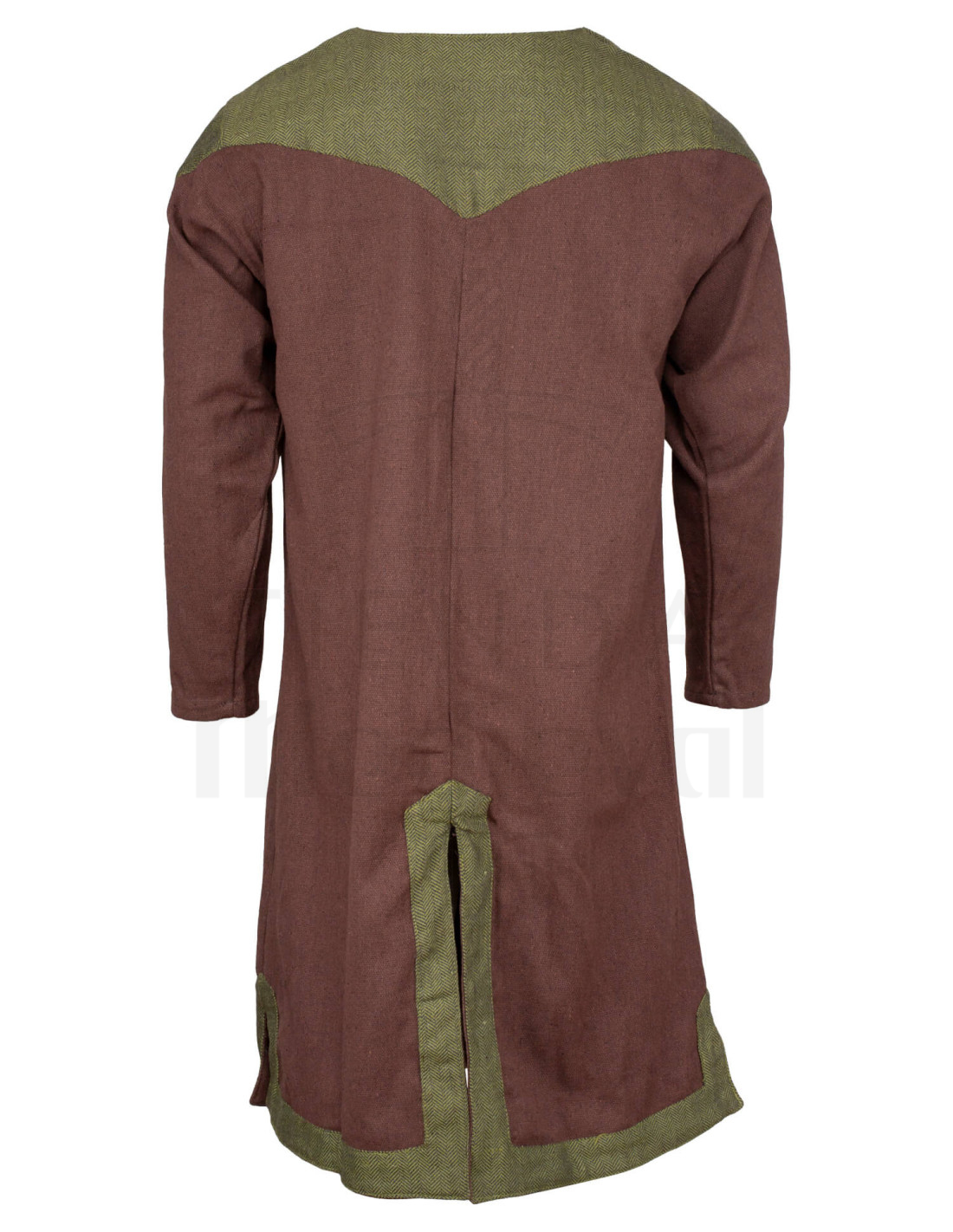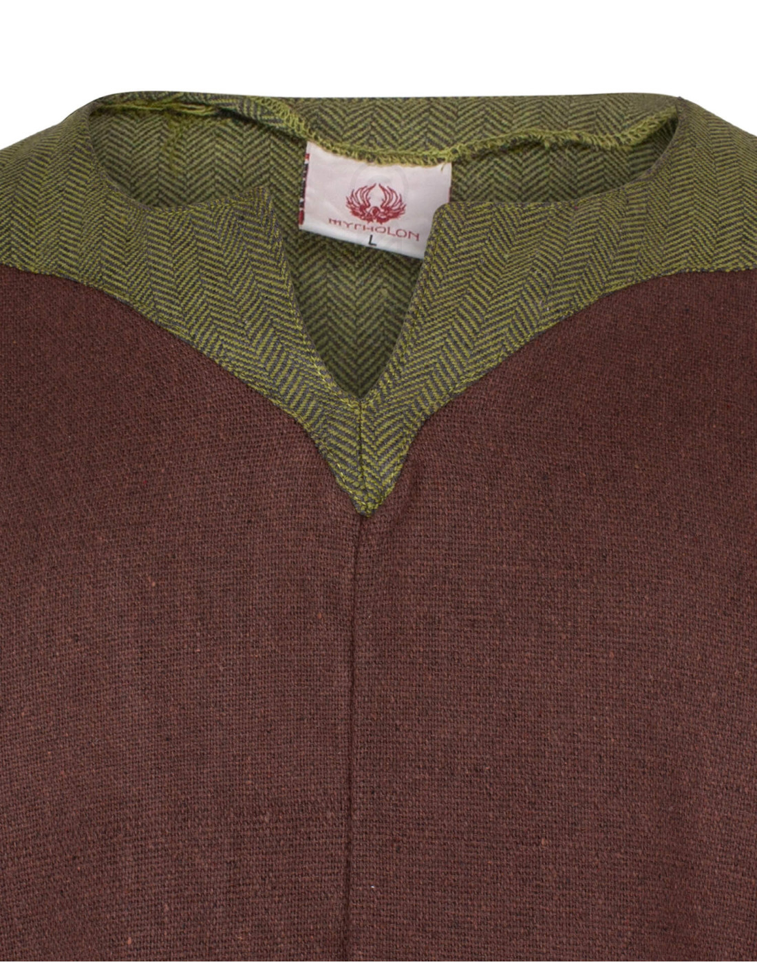 De details met visgraat-inzetten op de schouders en de fijne groene bies op de kraag, samen met de rand aan de onderkant en zijkanten, zorgen voor een verfijnde en authentieke afwerking. De decoratieve vooropening met een groene band maakt het comfortabel om te dragen en voegt een onderscheidend detail toe. De zichtbare textuur van de stof geeft een rustieke uitstraling, perfect voor LARP-evenementen, middeleeuwse recreaties of de komende themamarkt.
