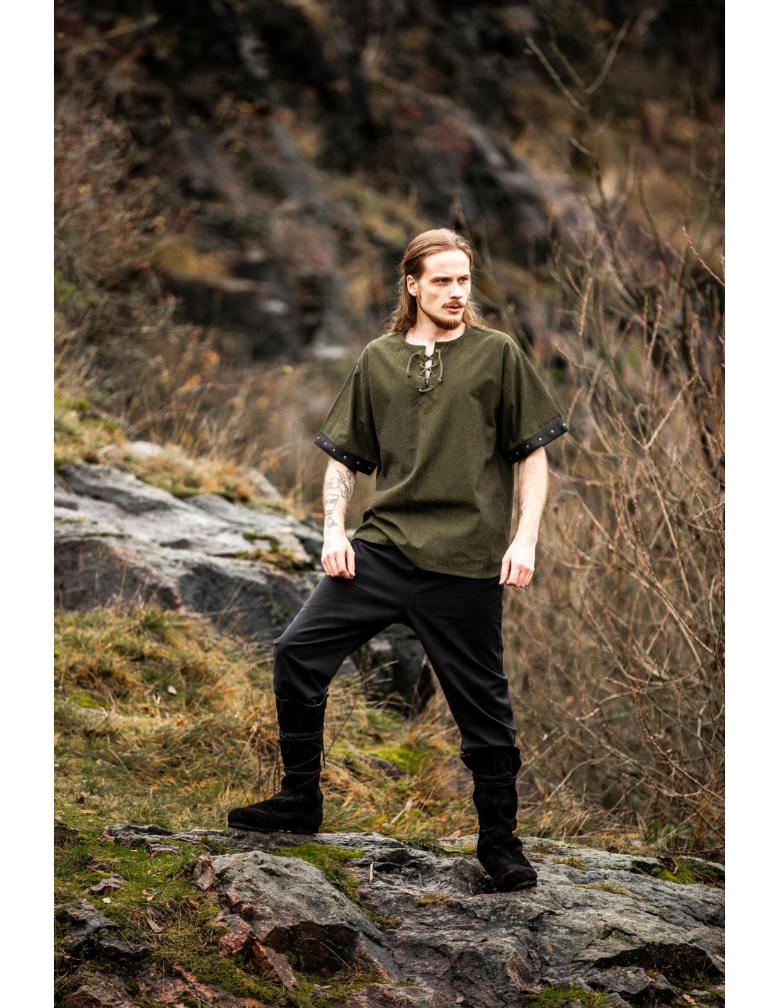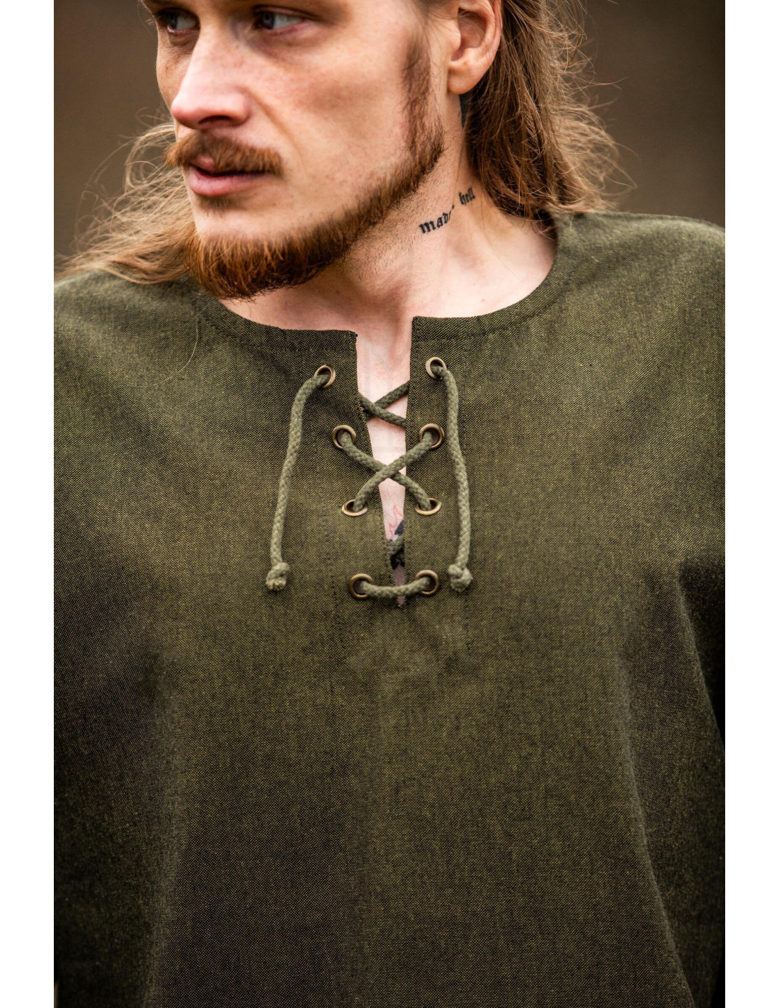 Het middeleeuwse herenoverhemd Hagen met echte lederen details transformeert historische esthetiek in een praktische ervaring. Zachte katoen streelt de huid en laat je gemakkelijk ademen tijdens lange dagen, terwijl de rechte en ontspannen pasvorm een natuurlijke val geeft die met je meebeweegt, niet tegen je. De henley-achtige veterkraag laat je de opening aanpassen naar jouw stijl of de temperatuur, wat een authentieke en eenvoudige touch toevoegt.