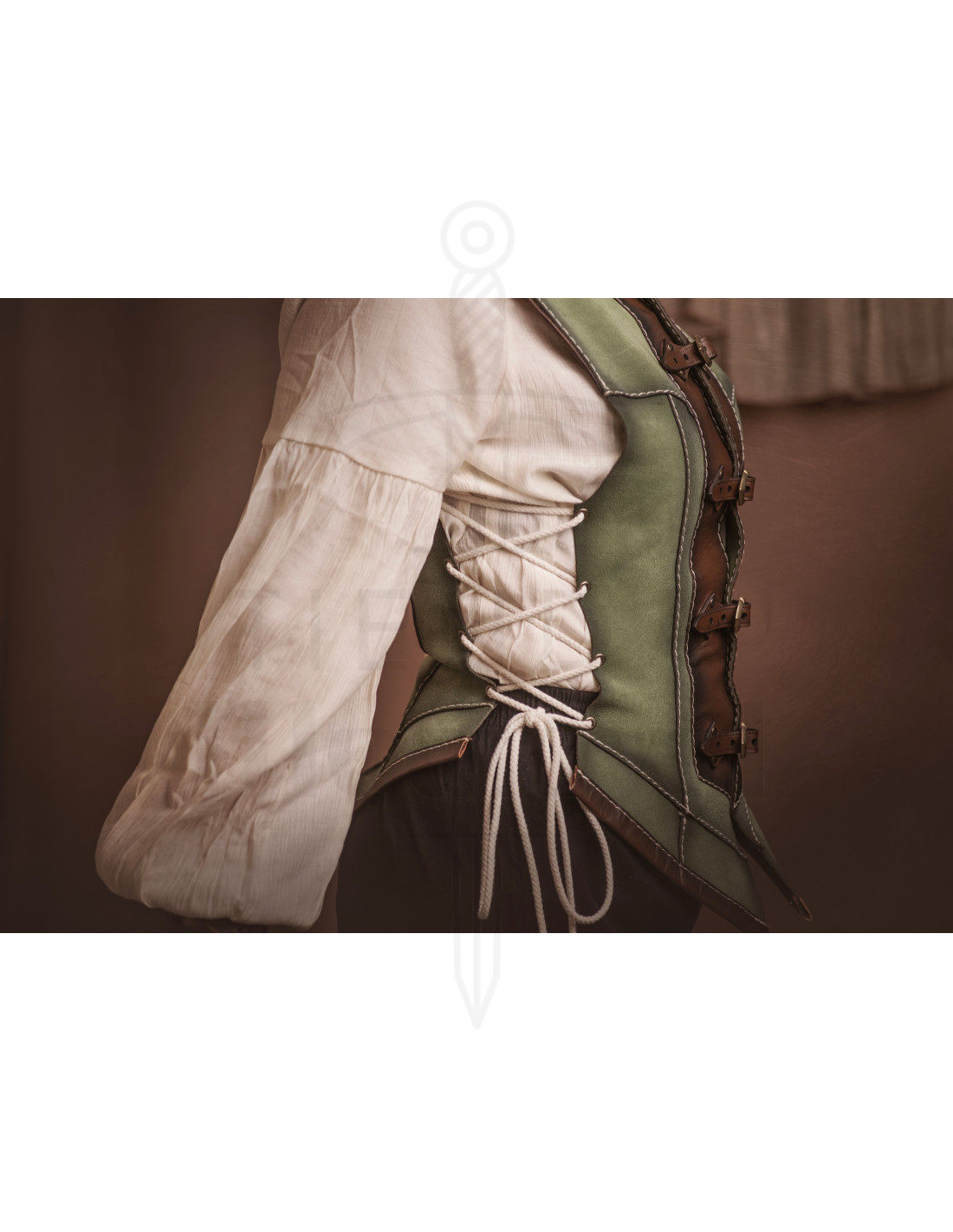 Wil je er stijlvol en comfortabel uitzien tijdens elke middeleeuwse avontuur? Dit korte groene suède leren jack is de perfecte keuze om een authentiek en duurzaam accent aan je herenoutfit toe te voegen. Gemaakt van hoogwaardig suède combineert het duurzaamheid en flexibiliteit, zodat je vrij kunt bewegen tijdens je gevechten of sociale evenementen. De leren versterkingen bij de hals, mouwen, zoom en voorkant zorgen voor extra weerstand, klaar om zowel een intens gevecht als de meest elegante banketten te doorstaan.