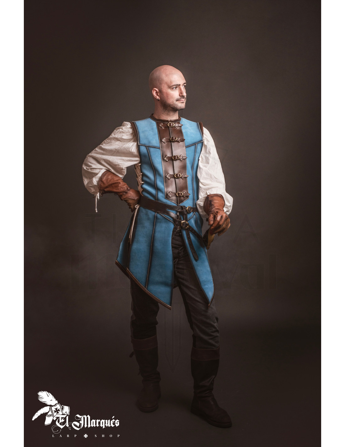 De lange middeleeuwse leren jas voor heren, blauwe suède, biedt die combinatie: een verfijnde afwerking en materialen die reageren wanneer je ze het meest nodig hebt. Hoogwaardig suède geeft een flexibele en comfortabele sensatie, waardoor bewegingen tijdens gevechten of lange tochten gemakkelijker gaan, terwijl versterkte delen bij de nek, mouwen, zoom en voorkant de meest blootgestelde zones versterken zonder de bewegingsvrijheid te beperken.