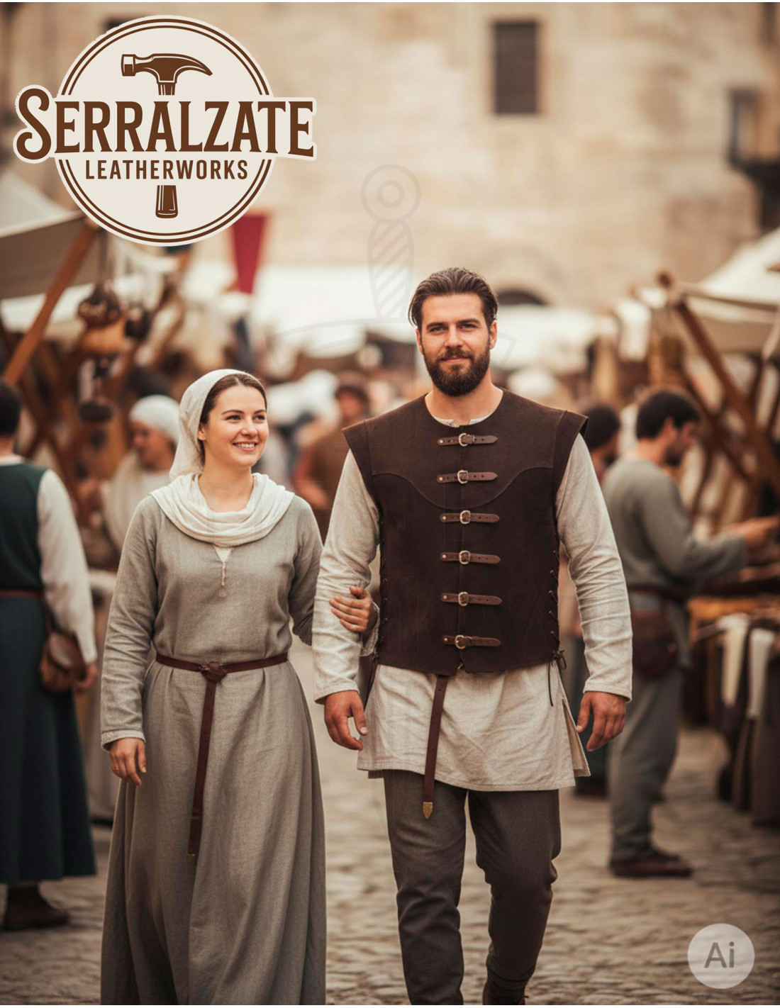 Elk detail is ontworpen om je outfit te verfraaien: het bewerkte leer geeft visuele impact en de verfijnde afwerking fungeert als de perfecte afsluiting tussen functionaliteit en elegantie. De gespen, bestand tegen langdurig gebruik, zorgen ervoor dat de weste zijn vorm en karakter door de tijd heen behoudt, met respect voor de geest van historische recreaties.