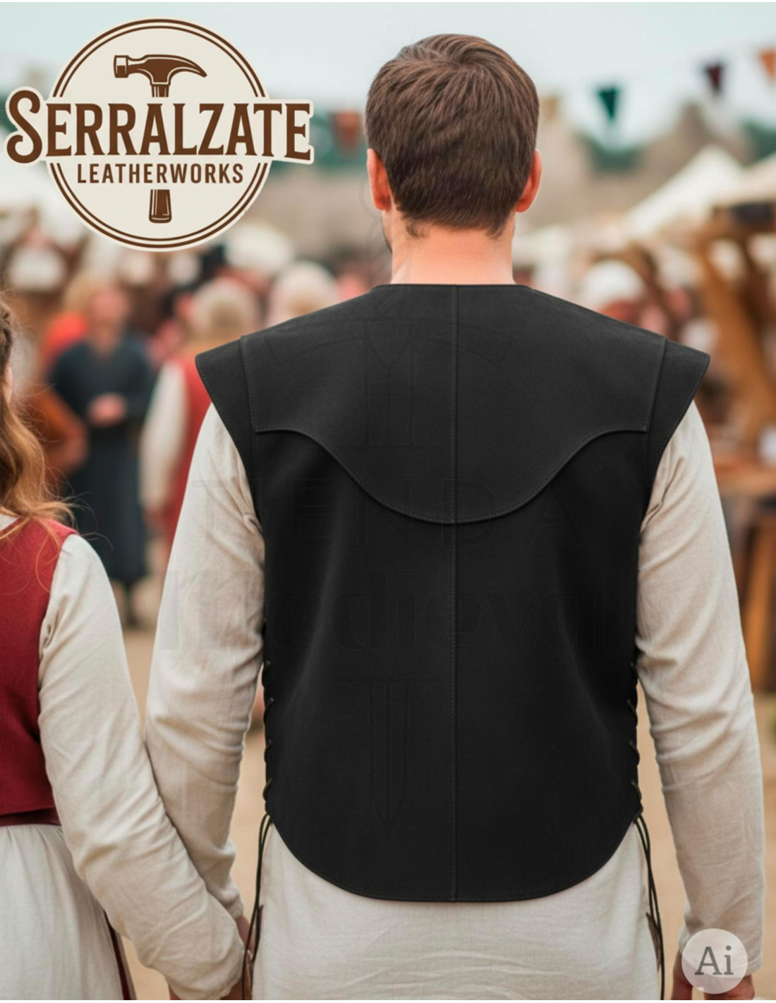 Dit vest transformeert traditionele materialen in een stuk dat bescherming en stijl combineert, ontworpen voor degenen die authenticiteit zoeken zonder in te boeten op comfort. De mix van suède en gestempelde leer geeft een nobele sensatie aan de aanraking, en de afwerking met hoogwaardige gespen zorgt voor een stevige en duurzame pasvorm, zodat je je zeker kunt bewegen tijdens re-enactments, middeleeuwse bruiloften of Live Role-spellen.
