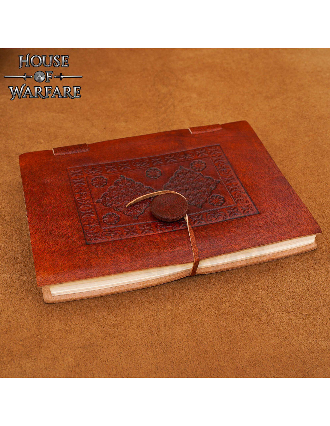 Als je op zoek bent naar een middeleeuws dagboek met leren omslag en gegraveerd ontwerp, heb je hier een stuk dat historische esthetiek combineert met hedendaagse functionaliteit, ideaal voor wie een karaktervol object wil voor creatieve projecten of persoonlijke notities.