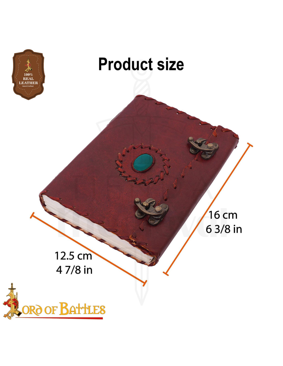 Dit middeleeuwse dagboek met leren kaft, steen en messing sluitingen valt op door zijn uitstraling en biedt een sensorische ervaring vanaf het eerste contact. De stevige, in donkerbruin leer beklede kaft beschermt je verhalen, terwijl het oppervlak en de zichtbare stiknaden de indruk geven van een handgemaakt, uniek en karaktervol object. De ovale turquoise steen in het midden vormt een focuspunt dat het dagboek transformeert tot een decoratief stuk, niet alleen een notitieboekje.