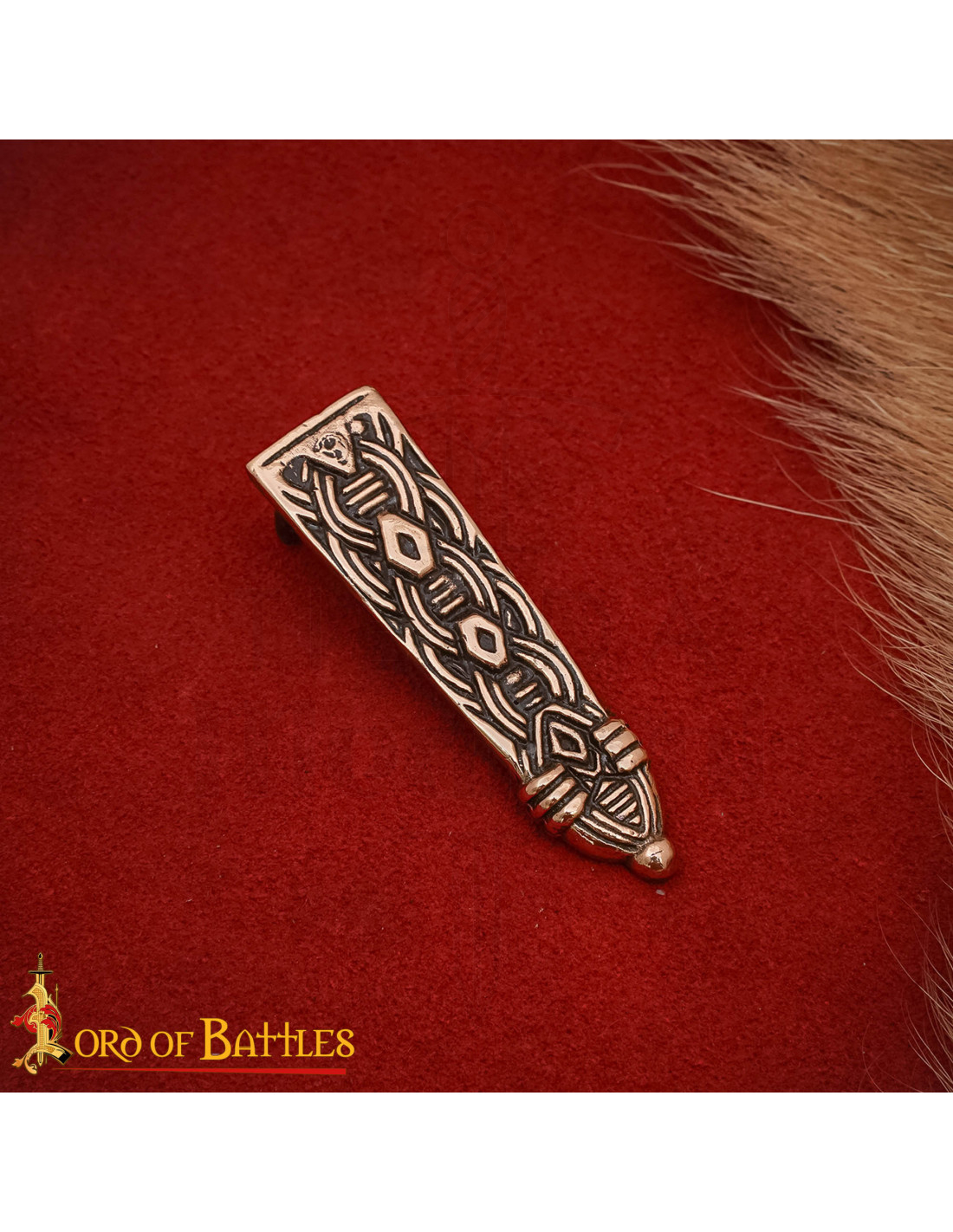 Geïnspireerd door noordse vondsten uit de Vikingtijd, geeft deze punt dat authentieke gevoel dat een gereconstrueerd outfit onderscheidt van een simpele imitatie. De afwerking in verouderd brons en de zwarte accenten benadrukken het reliëf, wat diepte toevoegt aan de knopen en geometrische ruiten, zodat het motief vanuit elke hoek duidelijk waarneembaar is.