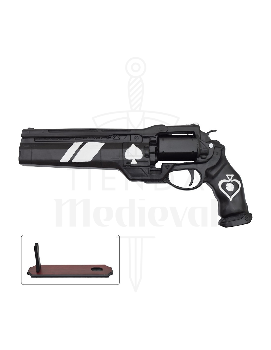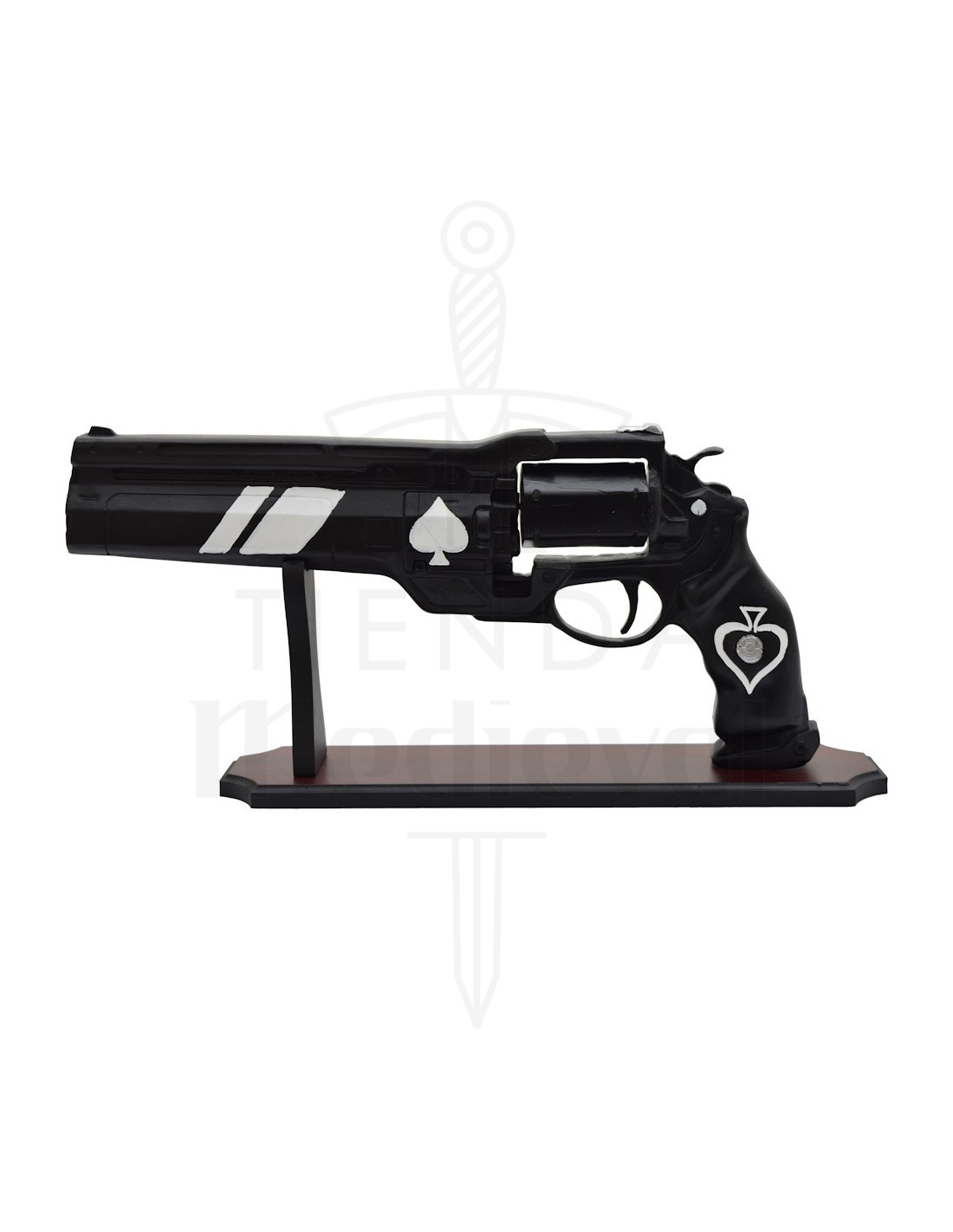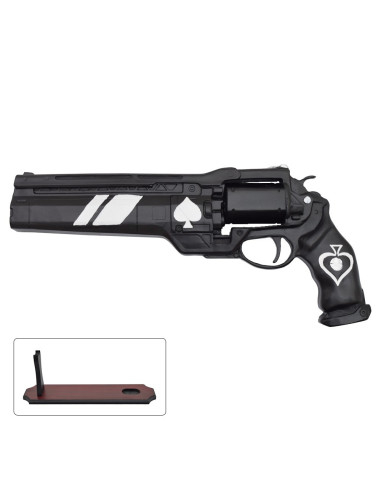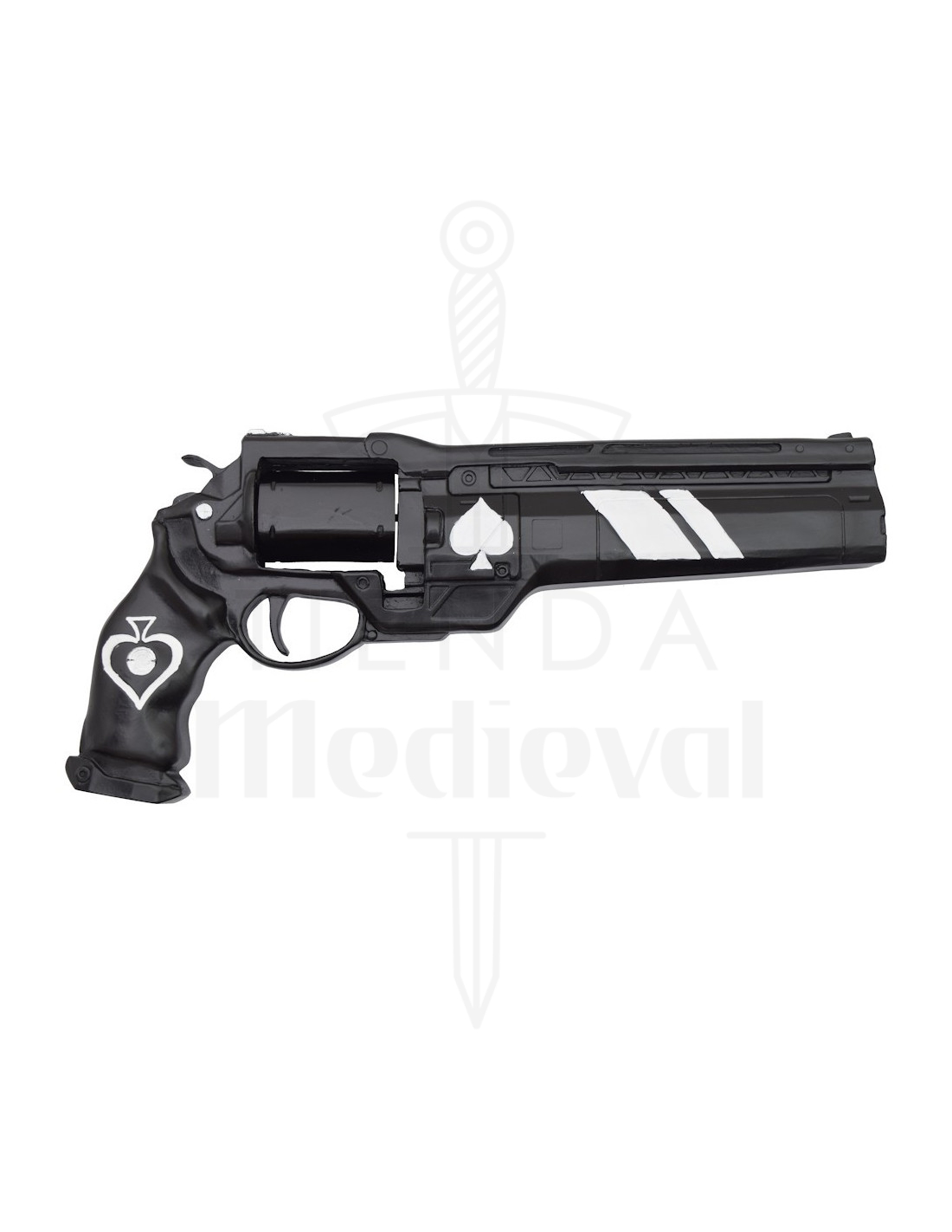 Dit ornamentale stuk brengt de geest van de beroemde fantasiepistool tot leven, met een intense zwarte afwerking en witte details die het symbol van de schoppenkaart en het kleine embleem op de greep, zoals een gekroonde vlam, benadrukken, wat het karakter en persoonlijkheid geeft. De cilinder, de trekker en de hamer zijn gegoten om de klassieke esthetiek van het ontwerp te behouden, terwijl het algemene uiterlijk de veiligheid en gemoedsrust van een niet-functionele replica behoudt, ideaal voor tentoonstelling op planken, muren of themacorners.
