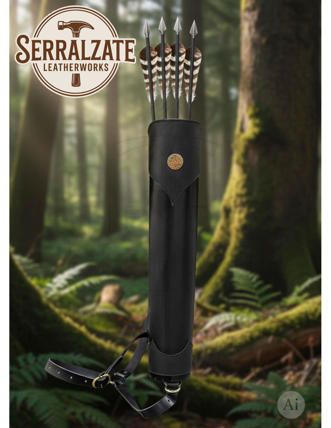 Deze echte zwarte leren rugquiver is met de hand gemaakt in Spanje van hoge kwaliteit leer, waardoor het een gevoel van stevigheid biedt en bestand is tegen wat je er in stopt. De gestikte constructie zorgt voor soliditeit, behoudt de vorm en vergemakkelijkt de snelle toegang tot de onderdelen, terwijl de voorste metalen versiering een vleugje karakter toevoegt dat elke uitrusting verfraait zonder de functionaliteit te verminderen. De verstelbare band met metalen verbindingen zorgt voor een comfortabel en stabiel vervoer, past zich aan verschillende houdingen aan en maakt het mogelijk om deze gedurende lange dagen zonder vermoeidheid te dragen.