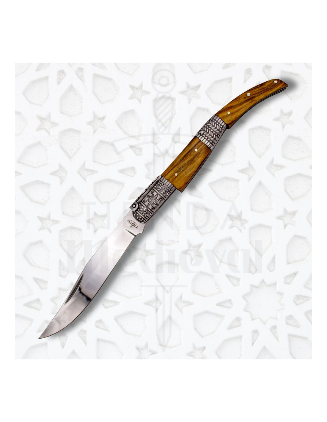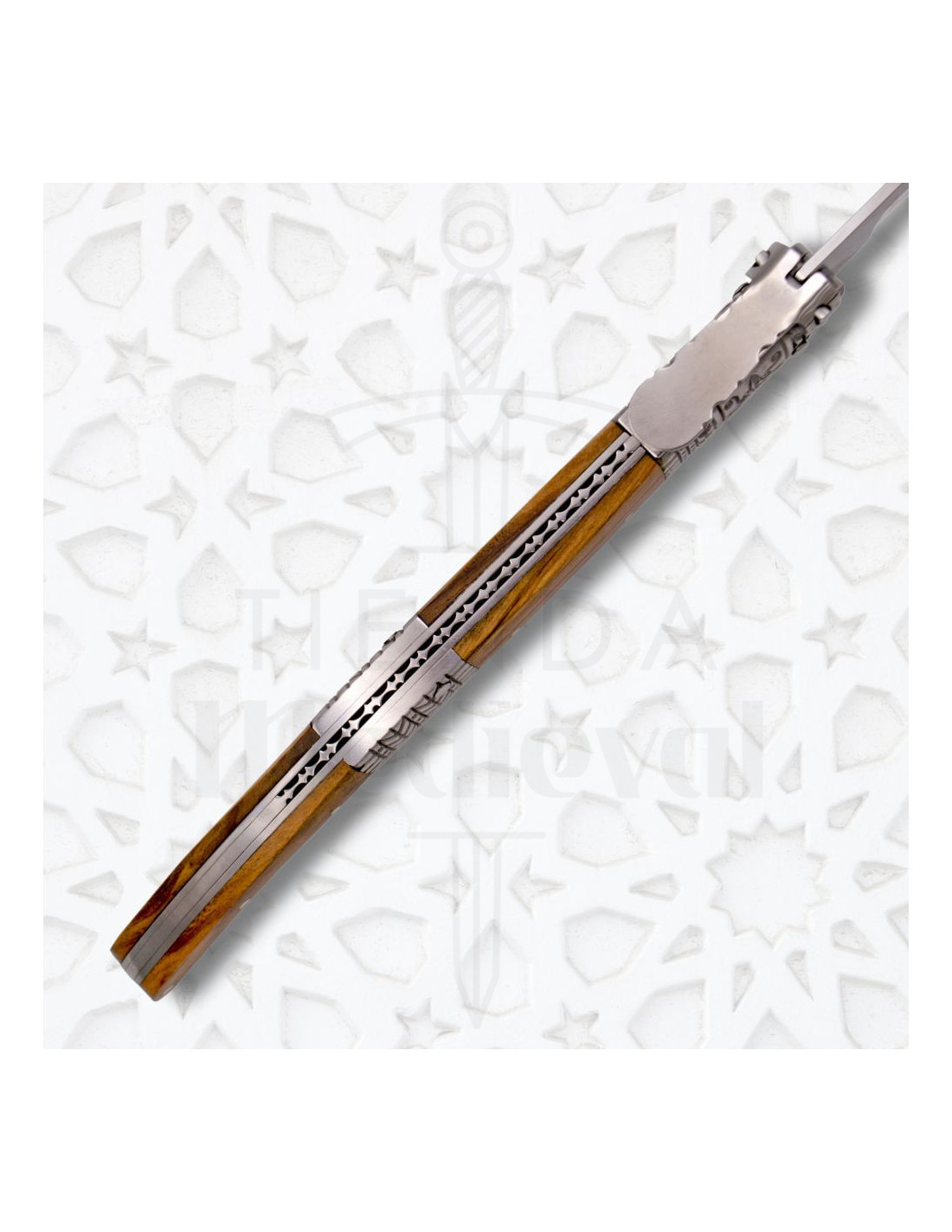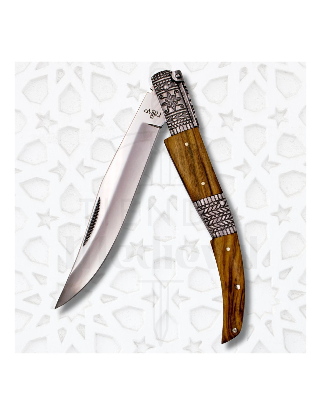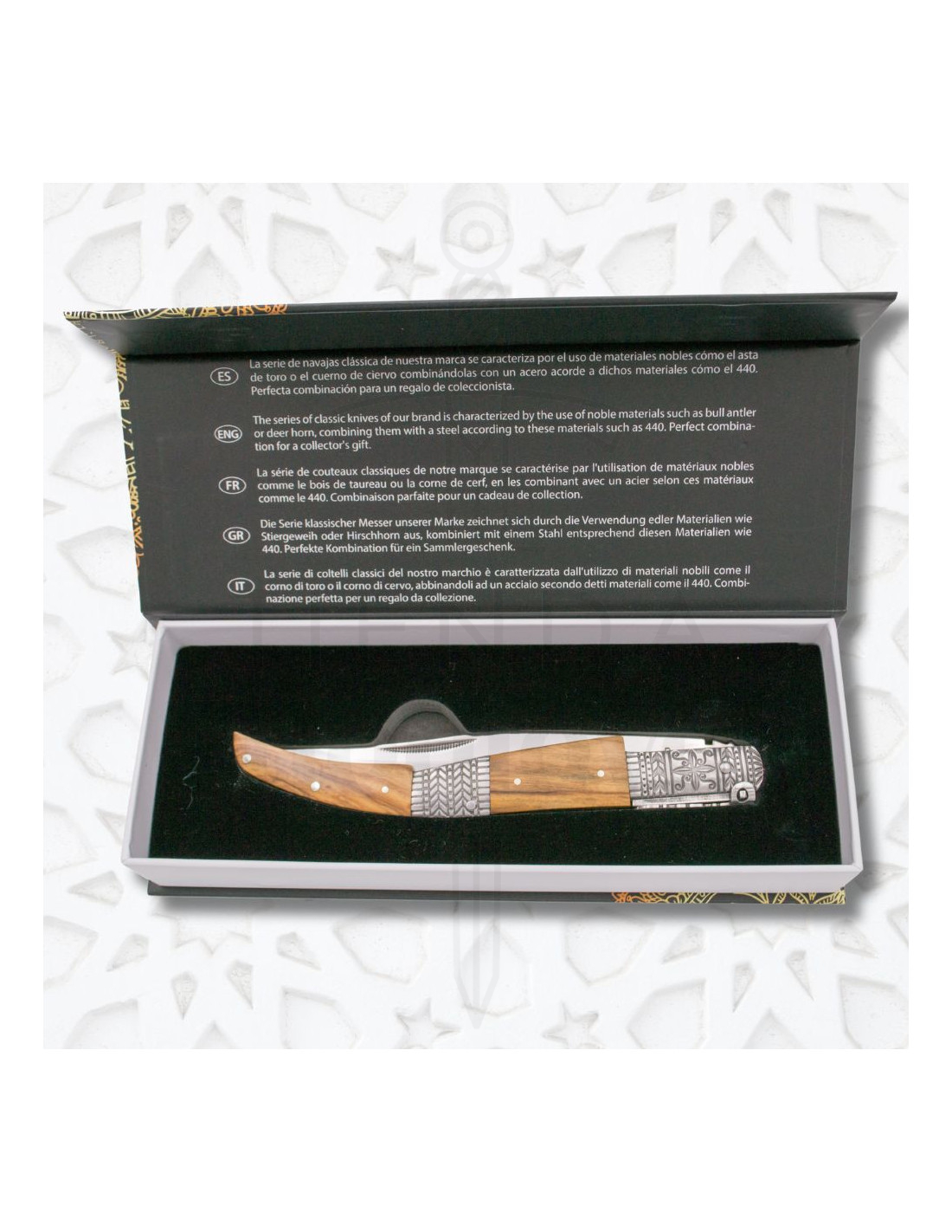 Het handvat, vervaardigd uit roestvrij staal en olijfhout, is niet alleen visueel aantrekkelijk, maar biedt ook een comfortabele en veilige grip. De decoratieve details in reliëf, geïnspireerd op de klassieke Spaanse messen uit de 19e eeuw, roept een rijke culturele erfenis op, waardoor elk gebruik een unieke ervaring is.