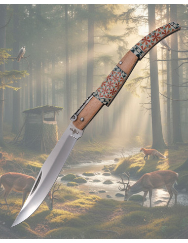 Het lemmet van 440 staal, gepolijst tot een spiegelglans en met een gebogen snijkant, maakt nauwkeurige sneden en eenvoudige reiniging mogelijk, terwijl de zijsleuf de opening van het lemmet optimaliseert voor een soepele uitklapbeweging wanneer je het nodig hebt. De versierde veer en het zichtbare sluitmechanisme zorgen voor een stevige vouw en vergrendeling, ontworpen voor wie functionaliteit en uitstraling waardeert.