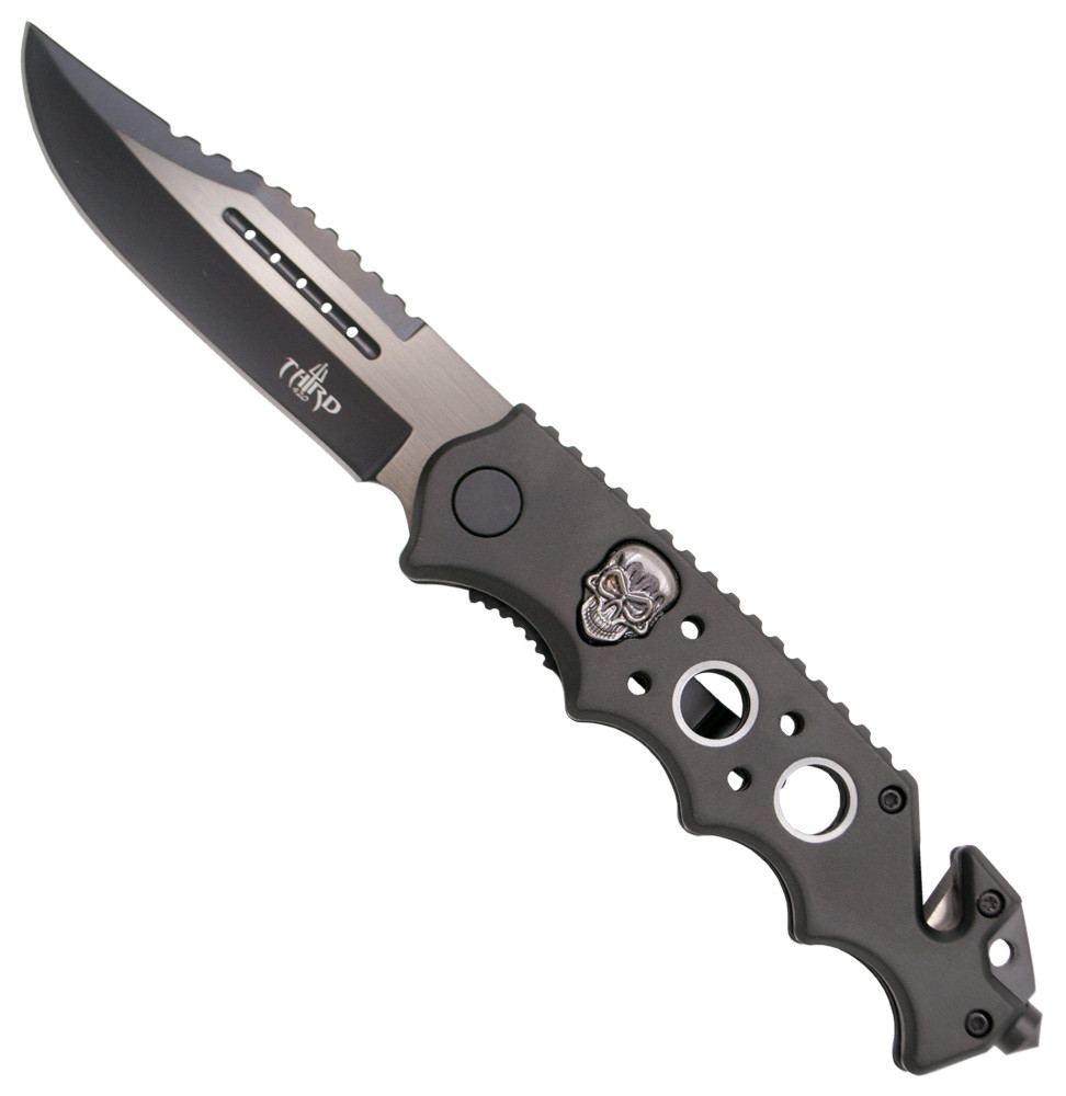 Met het Third Blackened Tactical Knife Skull Design heb je een stuk dat stijl en functionaliteit combineert in één accessoire. Met een totale afmeting van 21,2 cm valt dit mes op door zijn robuustheid en onmiskenbare karakter. Het mes van 9 cm, afgewerkt in zwart en grijs, biedt een perfecte balans tussen elegantie en prestatie, waardoor u gemakkelijk nauwkeurige sneden kunt maken.