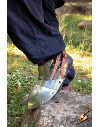 De bevestiging is eenvoudig en effectief dankzij een leren riem en gesp aan de achterkant van de voet, die ervoor zorgen dat de escarpes stevig op hun plaats blijven tijdens de actie. Zo kun je je volledig richten op de strijd, wetende dat je voeten volledig beschermd zijn.