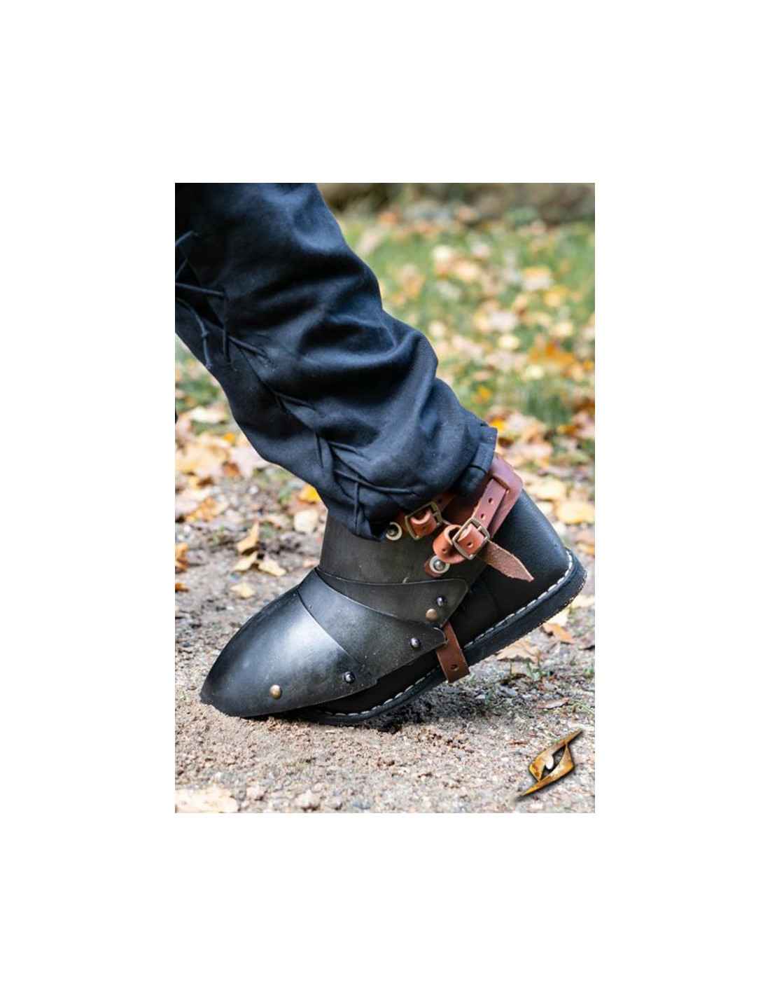 Deze Middeleeuwse escarpes in zwart van Epic Armoury zijn de essentiële aanvulling voor elke krijger die onverslaanbare bescherming wil combineren met een imposante uitstraling. Ontworpen om over je schoenen of laarzen te dragen, bieden ze maximale veiligheid tijdens je LARP-gevechten, historische reconstructies of thematische evenementen.