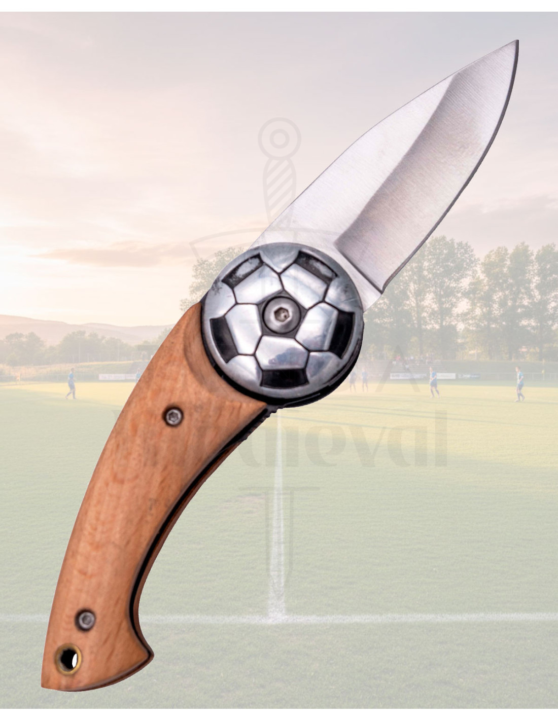 Dit mes combineert ontwerp en warmte, dankzij de beukenhouten handgreep die een comfortabele grip biedt en een natuurlijke textuur die met elk gebruik tot leven komt. De stalen schuilplaats stelt de klassieke voetbal voor, met de zilveren en zwarte oppervlakken die een decoratief en onderscheidend detail bieden, ideaal voor degenen die iets met een eigen persoonlijkheid zoeken.