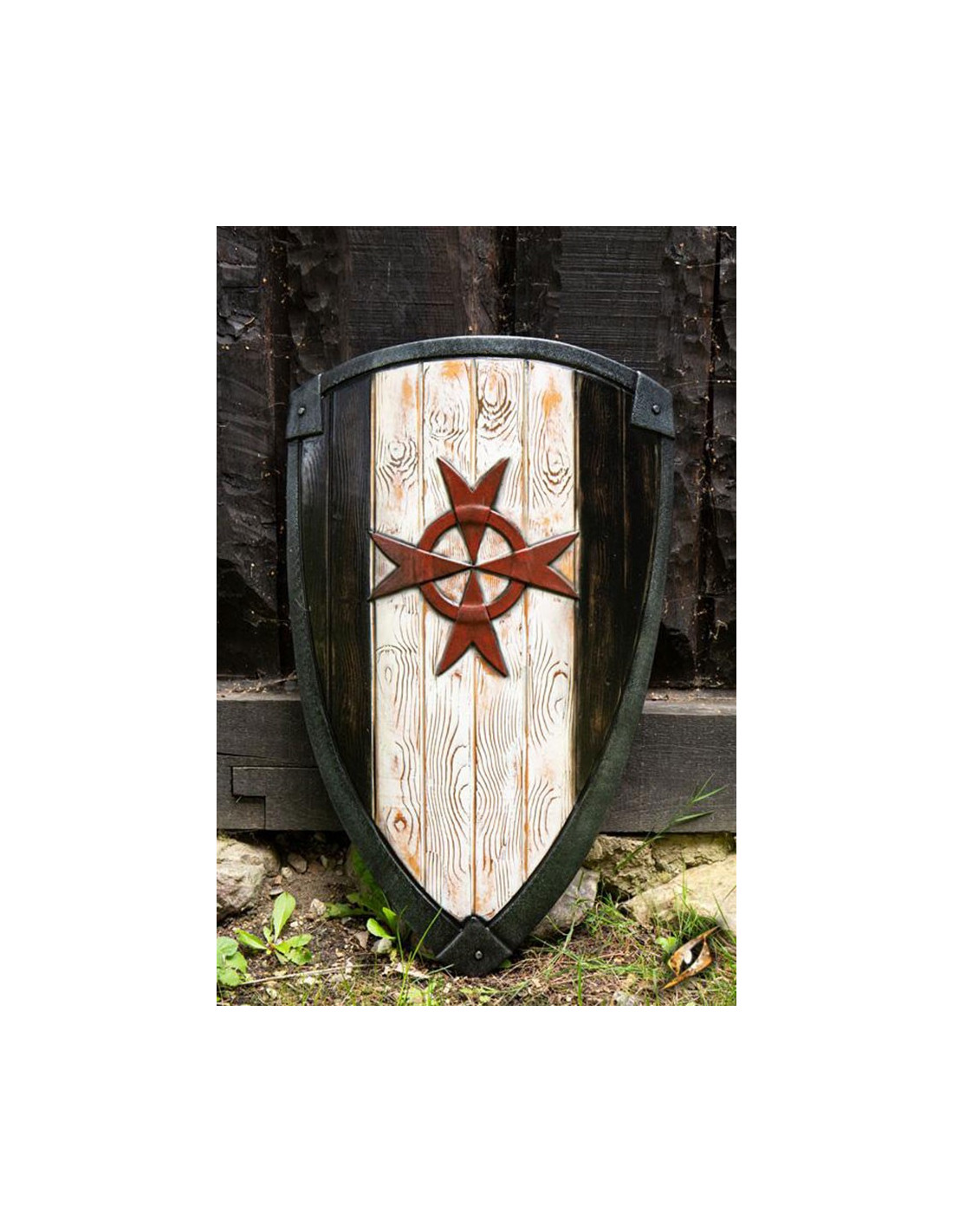 Een van de belangrijkste voordelen van dit schild is het zorgvuldig gedetailleerde ontwerp. Geschilderd met een patina met houtstructuur bedekt met een zwart-witte streep, metalen rand en rode heraldiek, is dit schild niet alleen visueel verbluffend, maar ook ontworpen om de tand des tijds en intensief gebruik te weerstaan.