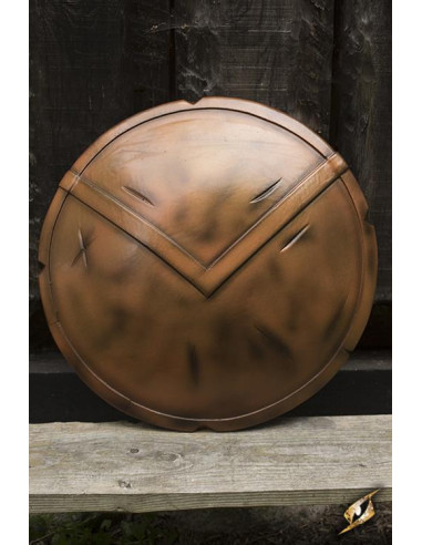 Een opvallend kenmerk van dit schild is de hoofdletter lambda, of V-vormig, uitgehouwen in zijn gezicht. Deze lambda is een symbool van moed en moed en geeft een authentiek en onderscheidend tintje aan het schild.