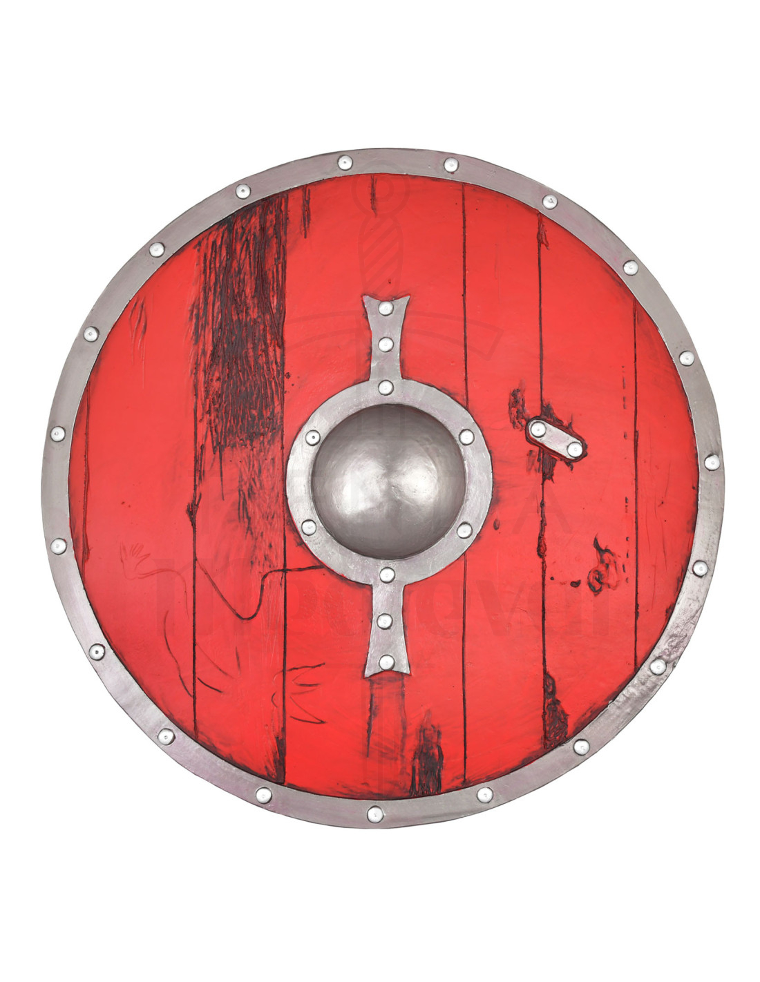 De brede en versterkte greep aan de achterkant past comfortabel, zelfs met handschoenen aan, waardoor je met vertrouwen kunt manoeuvreren en je positie kunt behouden in een gesloten formatie of in een één-op-één duel. De visuele details, van de klinknagels die het stuk omringen tot de centrale protuberantie beschermd door een frame, geven de historische afwerking die elke krijgers, shieldmaiden of scenische interpretatie naar een hoger niveau tilt.