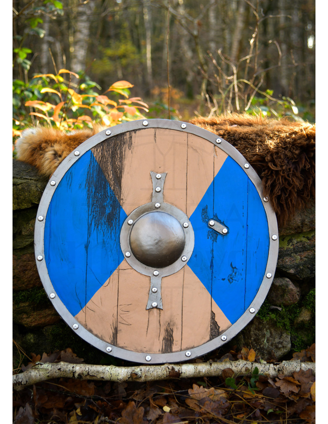 De rustieke esthetiek en de zichtbare nerven geven het de uitstraling van verouderd hout, terwijl de afwerking in blauwe en beige tinten, verdeeld in vier secties, karakter en aanwezigheid biedt in elk tafereel. De metalen rand met klinknagels en de bolvormige centrale protector versterken de indruk van uitrusting die voor de strijd is gesmeed, zonder concessies te doen aan de veiligheid en de lichtheid die je nodig hebt in de actie.