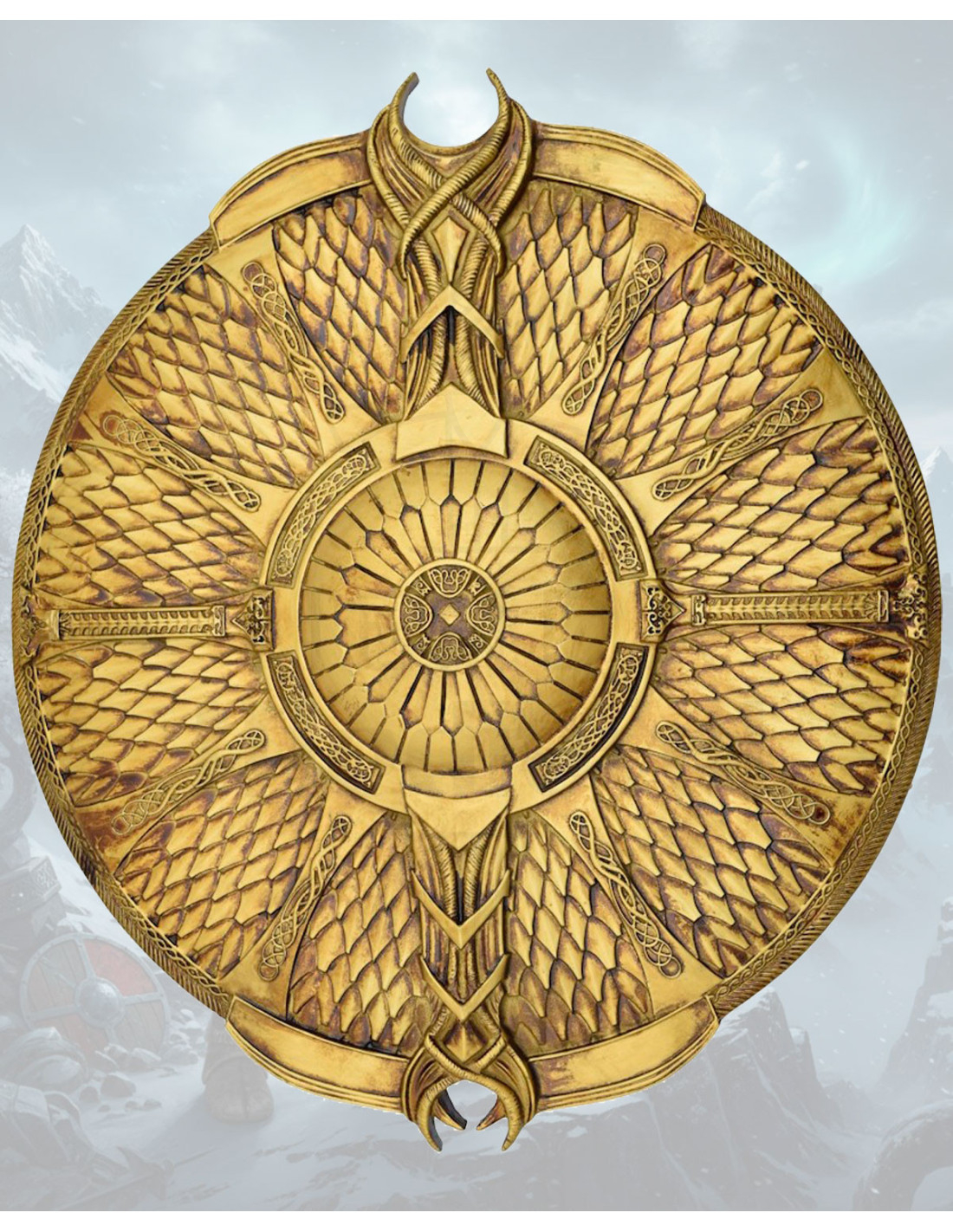 Dit decoratieve niet-officiële schild van Kratos, God of War, biedt die epische aanwezigheid zonder gedoe, dankzij het ronde ontwerp met gedetailleerd reliëf dat motieven combineert in de vorm van schubben of veren en vlechten die oude ambachtelijkheid oproepen. De verouderde gouden afwerking benadrukt elke omtrek, waardoor schaduwen en glans ontstaan die het reliëf vanuit elke hoek laten opvallen, terwijl de kruisen en structuren die het doorkruisen een dynamisch en symbolisch karakter toevoegen.
