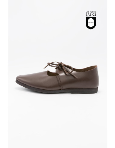 Bovendien garandeert de stevige vlakke zool, zorgvuldig bevestigd met spijkers, stabiliteit en duurzaamheid, ideaal voor wie op zoek is naar schoeisel dat hun historische wandelingen of recreaties met stijl en veiligheid begeleidt. Om de magie te behouden en ze in perfecte staat te houden, wordt het aanbevolen om moderne oppervlakken te vermijden en te kiezen voor accessoires zoals beschermers of speciale inlegzolen.