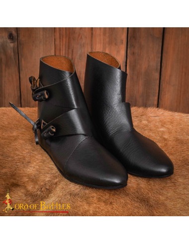 Met de hand vervaardigd uit echt leer van 2,5 tot 3 mm dikte, bootsen deze laarzen trouw de schoenen na die gevonden zijn in opgravingen in de mythische stad Jorvik, het oude York, een van de belangrijkste Vikingcentra in Engeland tijdens de 9e en 10e eeuw. De stevige platte leren zool, ontworpen voor natuurlijke terreinen, garandeert een authentieke en comfortabele ervaring, perfect voor wandelingen door bosrijke paden of middeleeuwse festivals.