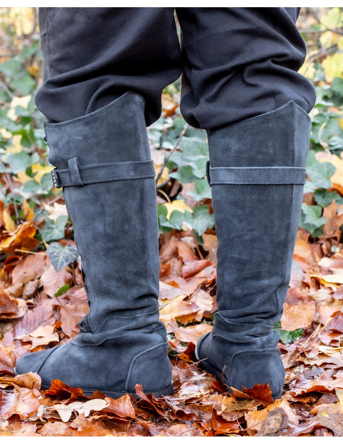 Deze middeleeuwse laarzen met veters model Taras, zwart, bieden een verbeterde pasvorm die de beweging van de voet volgt, dankzij een ontwerp dat knelt zonder te strak te zitten en de schacht tot net onder de knie aanpast. De sluiting met verticale veters en de bovenste riem met metalen gesp voegen niet alleen visueel karakter toe, maar stellen je ook in staat om de pasvorm voor meer veiligheid en stijl aan te passen.
