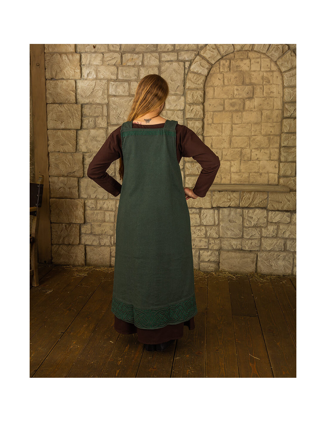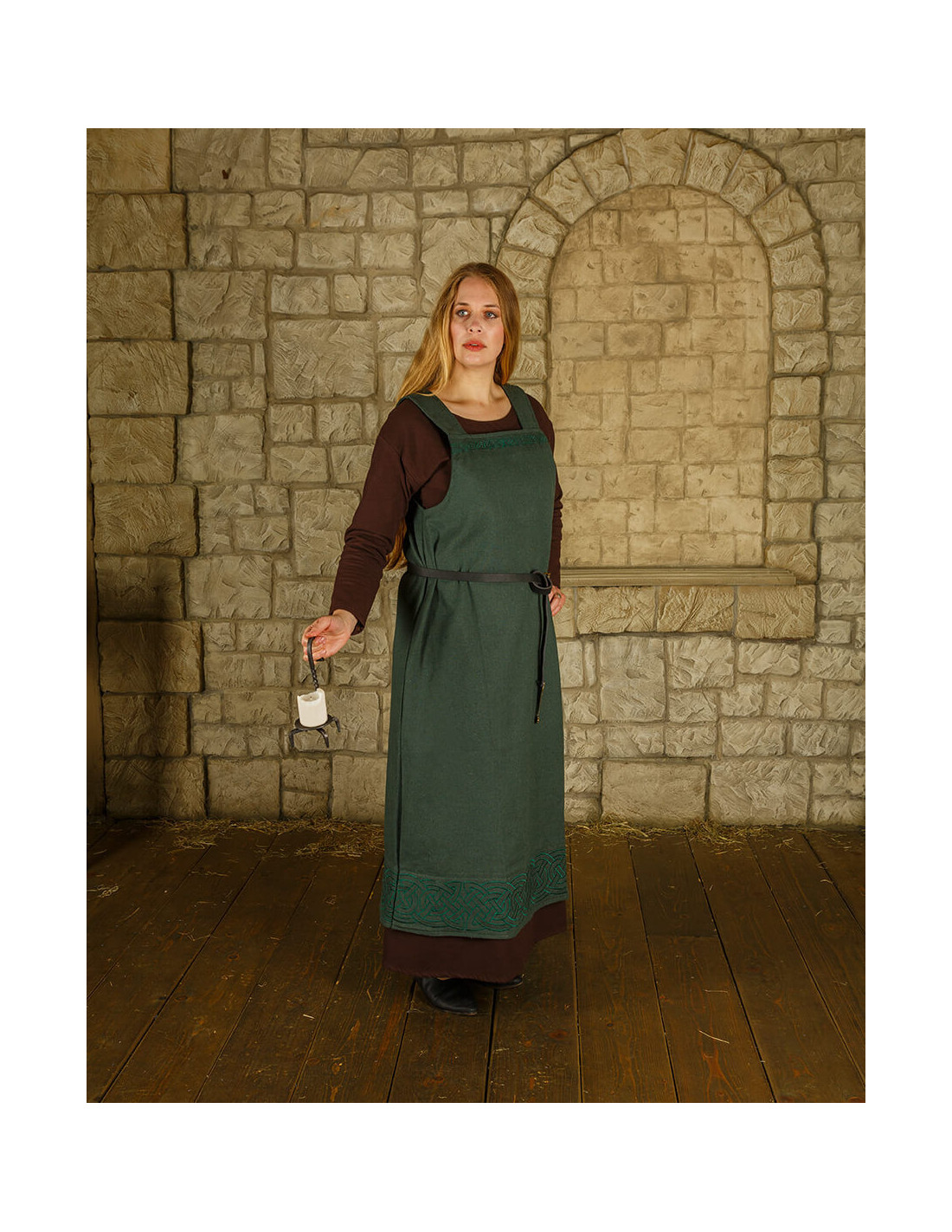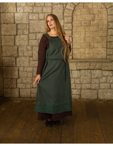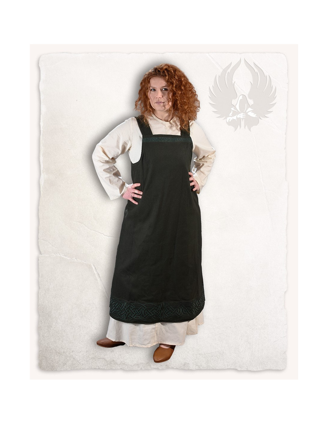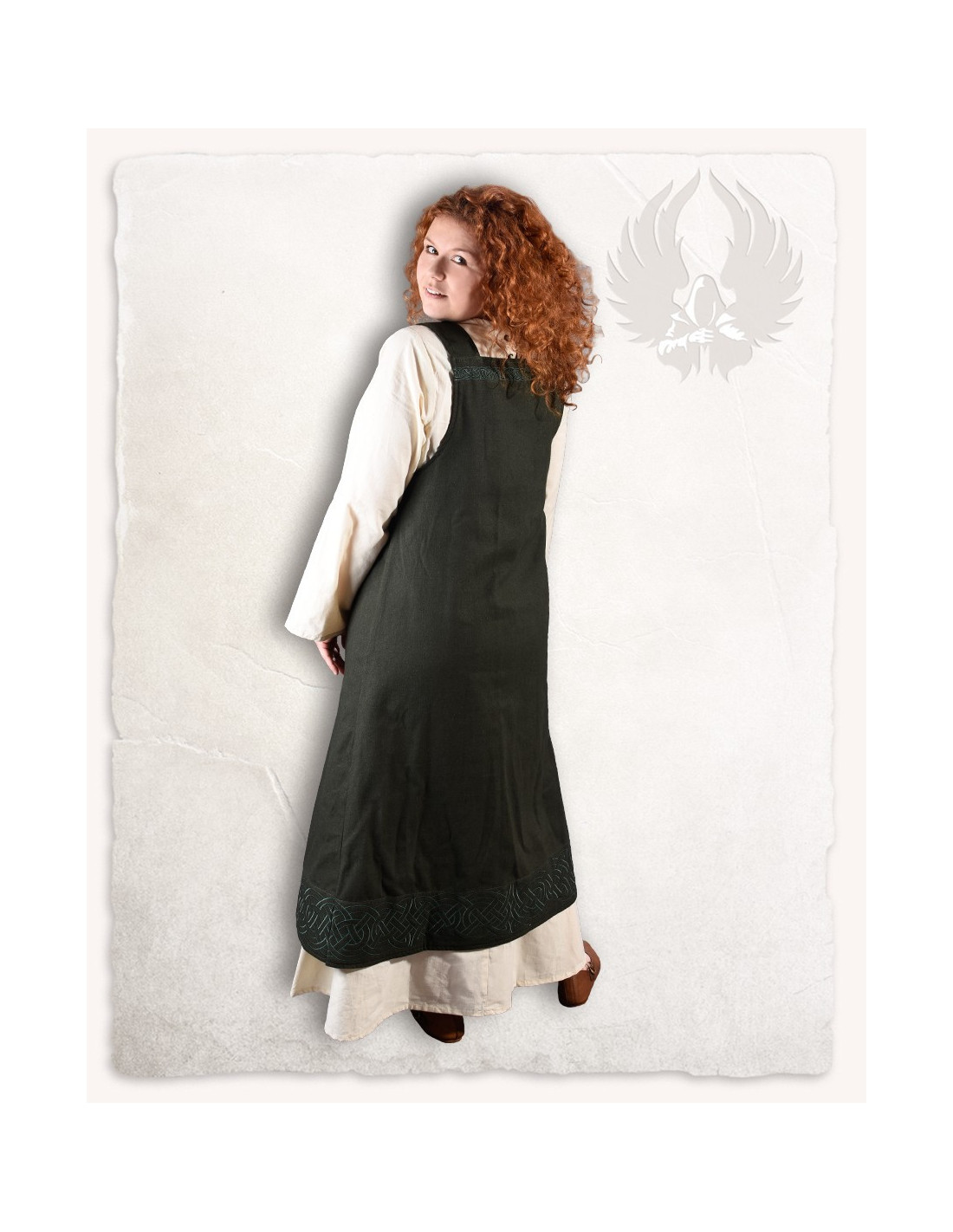 De Alva Viking schortjurk in groen is de perfecte keuze voor elk middeleeuws evenement. Het authentieke en gedetailleerde ontwerp neemt je mee naar het Vikingtijdperk, zodat je jezelf volledig kunt onderdompelen in de ervaring. Bovendien past het perfect bij ons ""Marita""-kledingstuk eronder voor extra comfort en stijl.