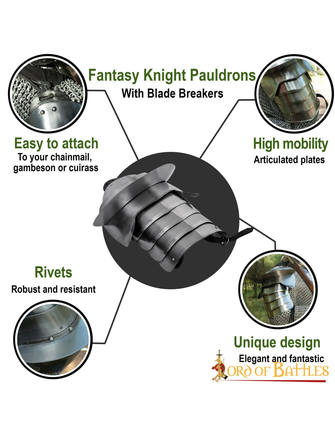 Bent u op zoek naar authentieke en duurzame middeleeuwse ridder schoudervullingen? Kijk niet verder! We presenteren de Medieval Knight Shoulder Pads met Leaf Breaker van het gerenommeerde merk Lord of Battles.