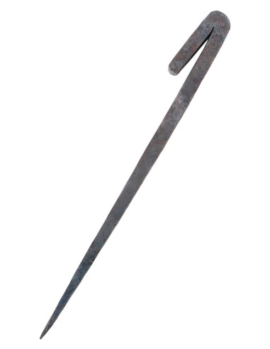 Met de hand vervaardigd uit kwalitatief gesmeed staal, beschikken deze haringen over die robuuste kracht die alleen vakmanschap kan garanderen. Het eenvoudige en stevige ontwerp, met een haak aan de bovenkant, maakt het gemakkelijk om ze precies in te slaan en touwen of doeken vast te zetten zonder te glijden. Deze traditionele vorm vervult niet alleen zijn functie, maar voegt ook een rustieke charme toe, ideaal voor historische recreaties of voor wie authentieke uitrusting waardeert tijdens outdoor avonturen.