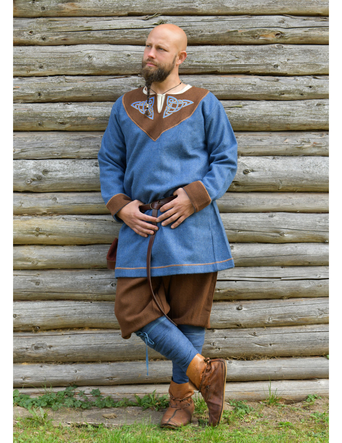 Als je zoekt naar het kopen van Vikingse Winingas van Blauwe Wol voor Historische Outfit, vind je hier een balans tussen historische trouw en moderne praktisch: trouw uiterlijk aan de periode, aangenaam aanvoelen en een presentatie die het onderhoud vergemakkelijkt. Een detail dat elke recreatie zonder complicaties verheft, gedacht voor degenen die authentieke materialen en een vorm waarderen die het verleden respecteert.