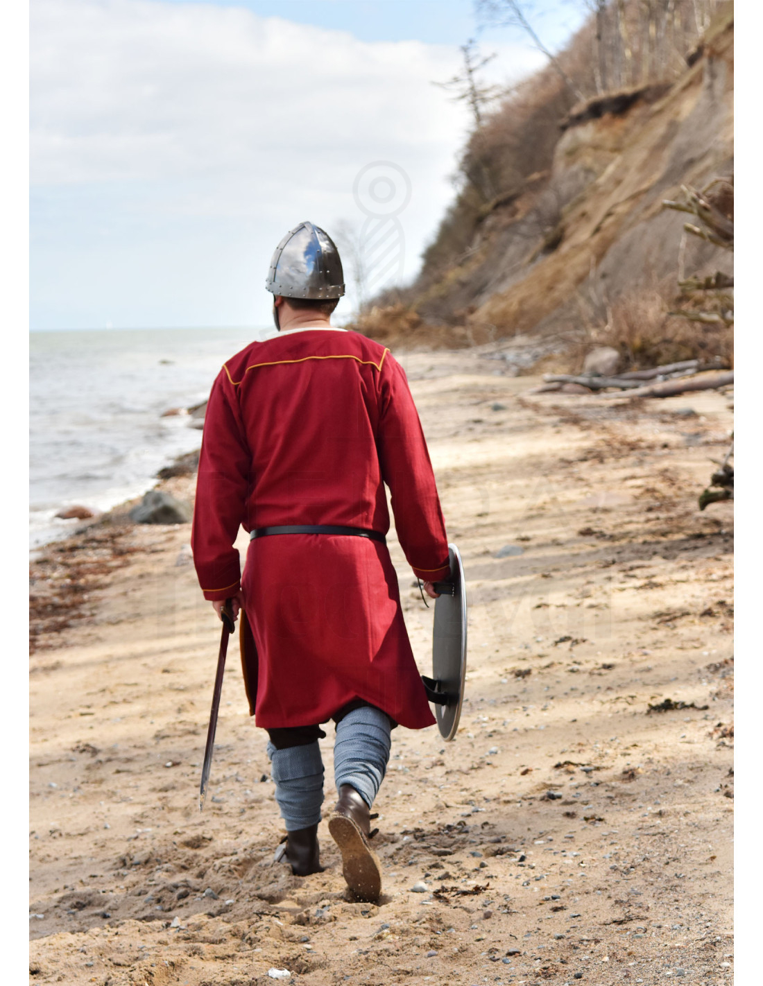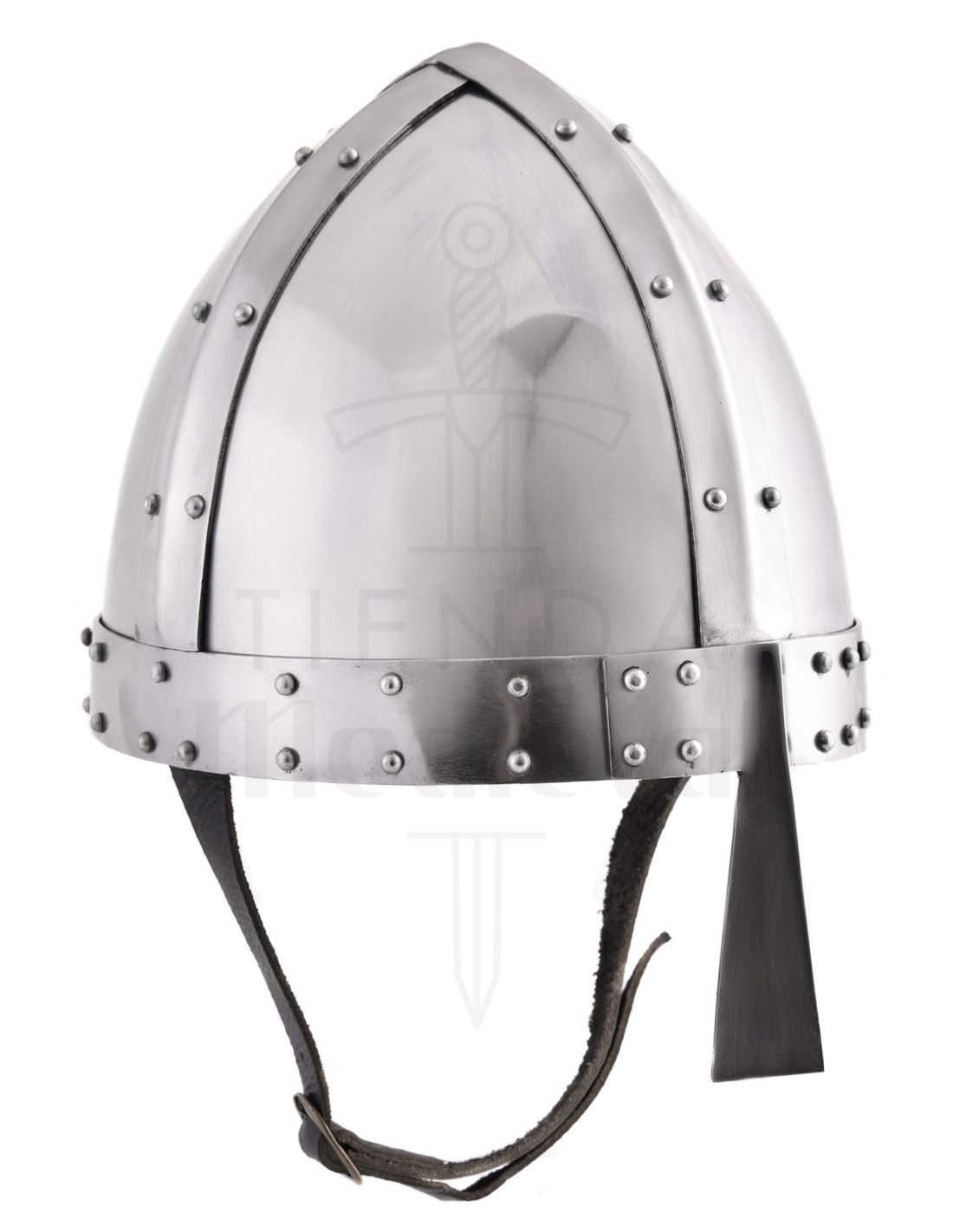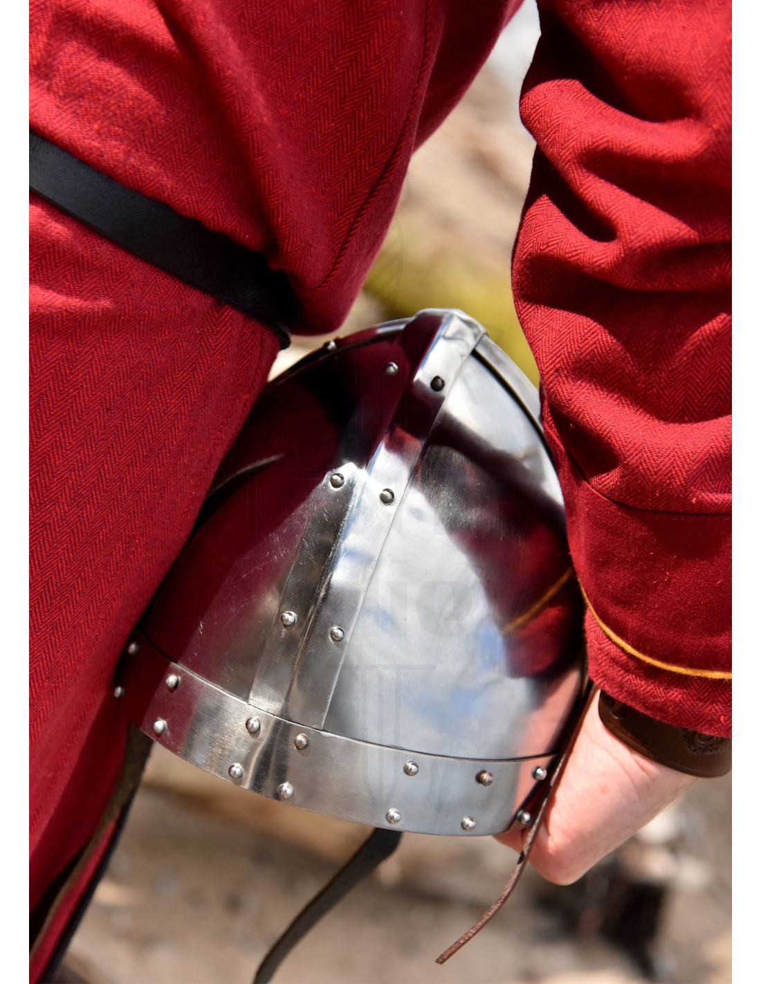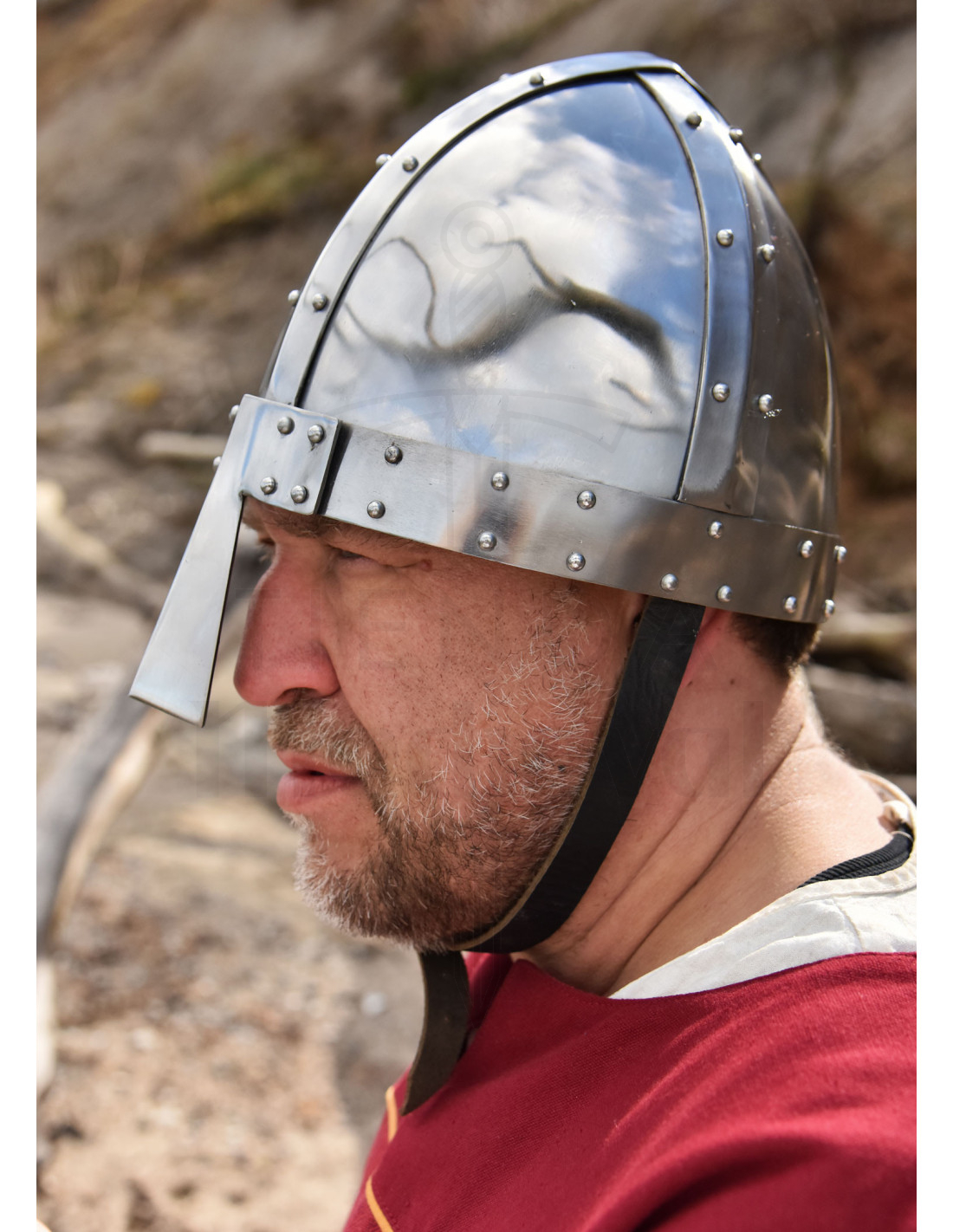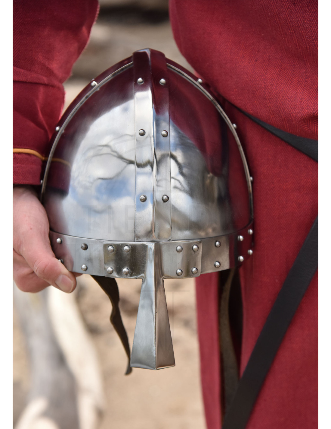 Het is niet moeilijk om je een dappere Viking- of Normandische krijger voor te stellen, gekleed in deze imposante helm, zijn zwaard hanterend en zijn leger in de strijd leidend. Deze functionele helm, gebruikt in de 11e eeuw, neemt je mee terug naar die spannende middeleeuwen en laat je de heldendaden van die dappere en gedurfde krijgers herbeleven.