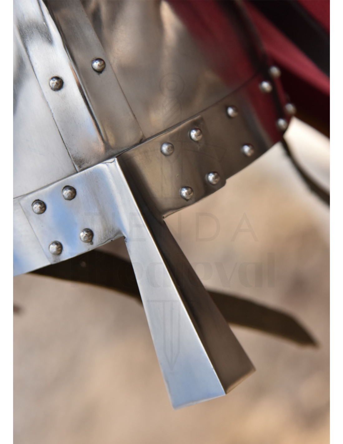 Een van de meest opvallende kenmerken van deze helm is de neusbescherming van 3,5 mm, die meer veiligheid biedt in de strijd door de neus te beschermen. Bovendien is hij voorzien van een sluiting van rundleer met een bronzen gesp, ontworpen om stevig op de kin te zitten en de helm op zijn plaats te houden tijdens de meest intense bewegingen.