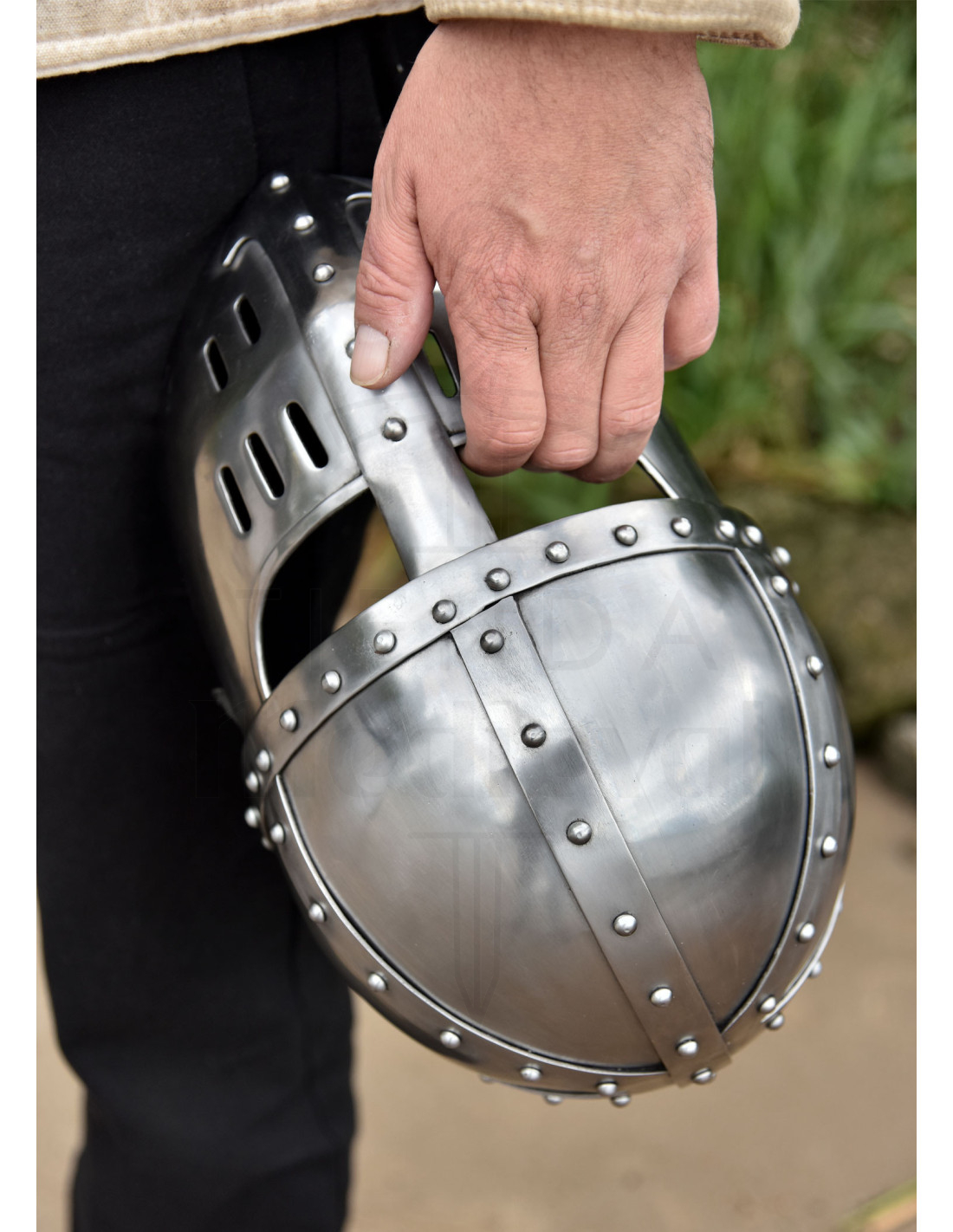 Ontdek de Spangenhelm Helm met vizier, een authentiek juweel uit de hoogmiddeleeuwen. Deze helm, gebruikt door de Noormannen en Kruisvaarders, neemt je mee naar die tijden van ridders en epische veldslagen.