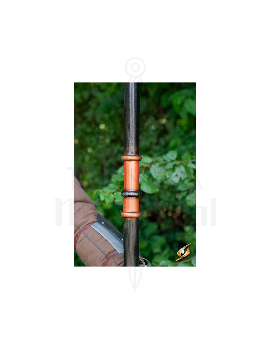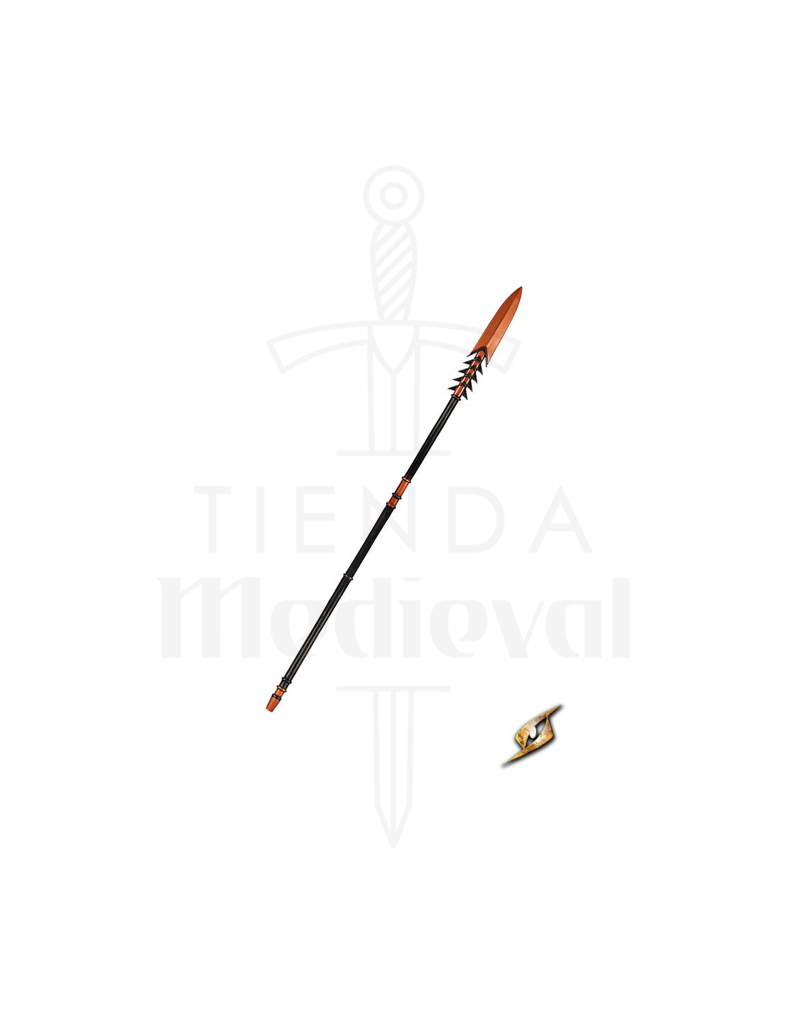 Het getande blad en de afwerking in een levendige bronsoranje tint vallen meteen op, waardoor een gevoel van ouderdom en kracht aan je personage wordt toegevoegd. De handgreep, zorgvuldig geschilderd om verweerd metaal en leren omwikkelingen na te bootsen, combineert duurzaamheid met esthetiek en zorgt voor een stevige grip bij elke slag. De speer, met een lichaam dat realistisch de textuur van robuust hout imiteert, is licht en gemakkelijk te hanteren, ideaal voor snelle bewegingen en dynamische gevechten.