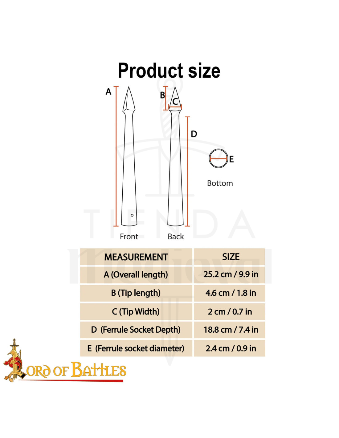 De afmetingen zijn indrukwekkend: hij is ongeveer 24,1 centimeter lang met een diameter van ongeveer 1,6 centimeter voor de stok. Deze speer is ontworpen om in een stevige steel te passen en een uitzonderlijke balans te bieden.