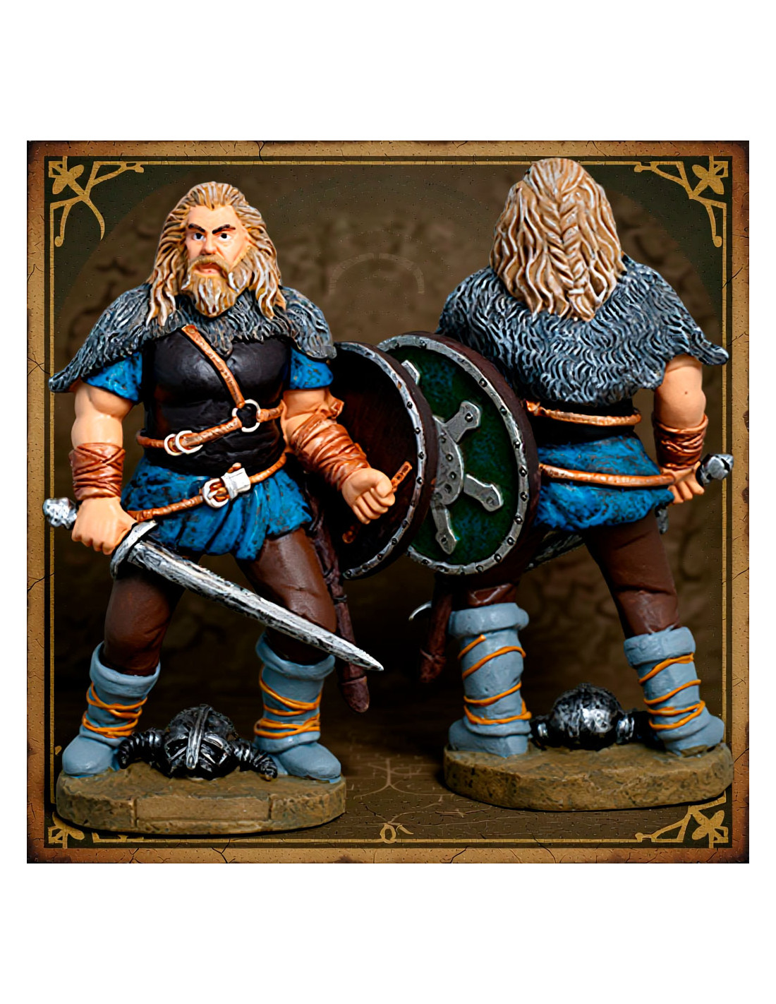 Ontdek een Viking krijger die kracht en moed belichaamt in elk detail. Met zijn lang blond haar, vergezeld van een even lichte baard, vangt deze harsfiguur de essentie van een strijders uit oude tijden, klaar om elke uitdaging aan te gaan.