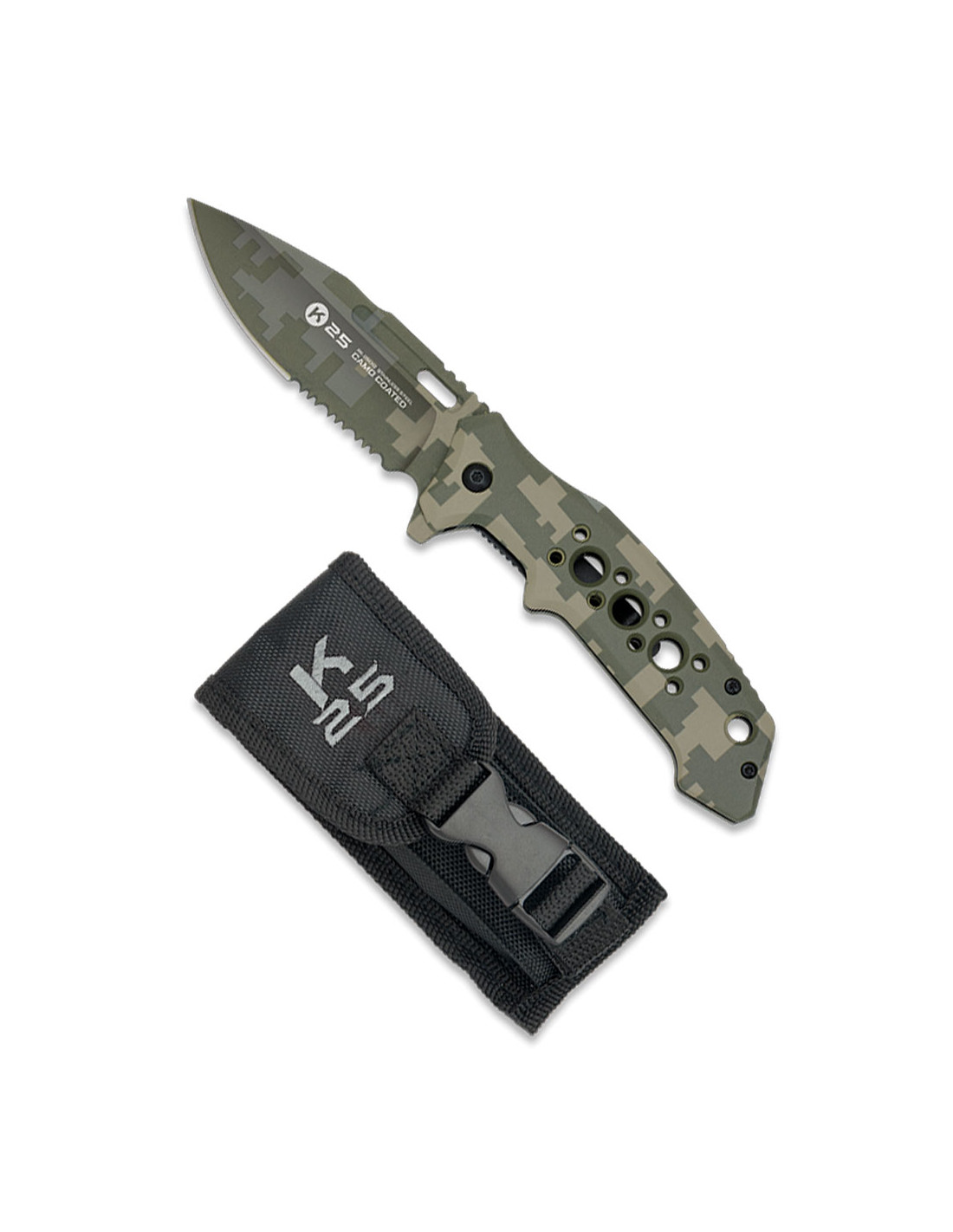 Ben je op zoek naar een betrouwbare en stijlvolle tool voor je avonturen of tactische taken? Dit mes K25 met camouflage groen aluminium handvat combineert duurzaamheid en een ontwerp dat is bedacht om je precisie en weerstand te bieden bij elk gebruik.