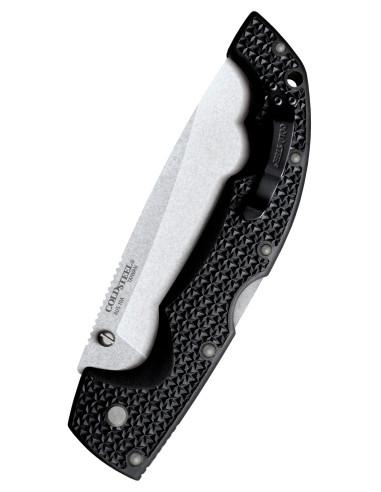 De stalen handgreep biedt een comfortabele en stevige grip dankzij de ergonomische vorm en zorgvuldig bewerkte textuur. De kromming die voor de handen is ontworpen vermindert vermoeidheid en verbetert de controle bij delicate manoeuvres, terwijl de opening en het gat in het mes een snelle eenhandige opening mogelijk maken.