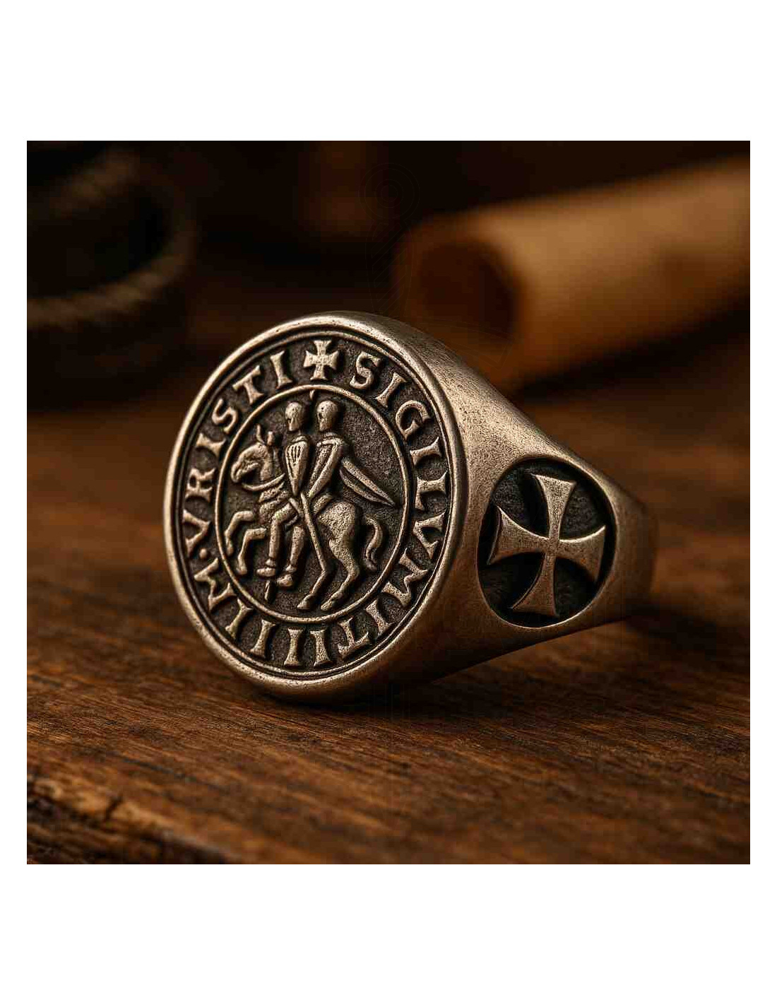 Tempeliersring gemaakt van metaal met oud zilveren afwerkingen. Verkrijgbaar in verschillende maten. De versiering omvat de Tempeliers met de legende en het Tempelierskruis.