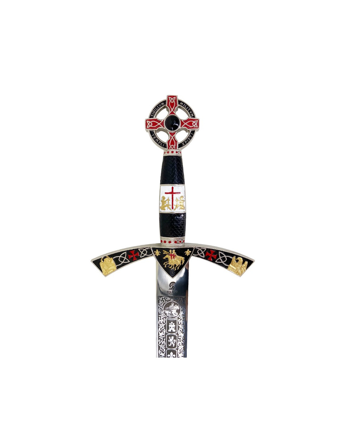 De pareerstang en het gevest van dit zwaard zijn versierd met gravures die verwijzen naar de Tempeliers, wat het een authentiek en uniek tintje geeft. Bovendien is de pommel voorzien van een Tempelierskruis en de legende van de Tempeliers, waardoor dit stuk nog meer historische waarde krijgt.