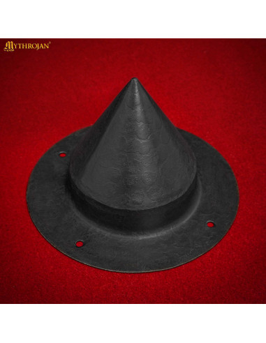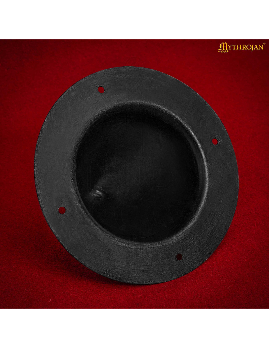 De afwerking in antiek zwart met een gehakte textuur geeft niet alleen een verweerde en authentieke uitstraling, maar versterkt ook zijn strijdkarakter, ideaal voor Stage Combat, LARP of tentoonstellingen. De kegelvorm en de gehakte oppervlakdetails roepen ontwerpen van middeleeuwse Duitse schilden op, geïnspireerd door de esthetiek van de eerste Germaanse krijgers, en brengen gevoelens van kracht en bescherming in elke klap.