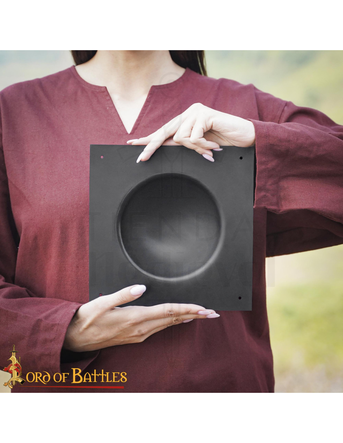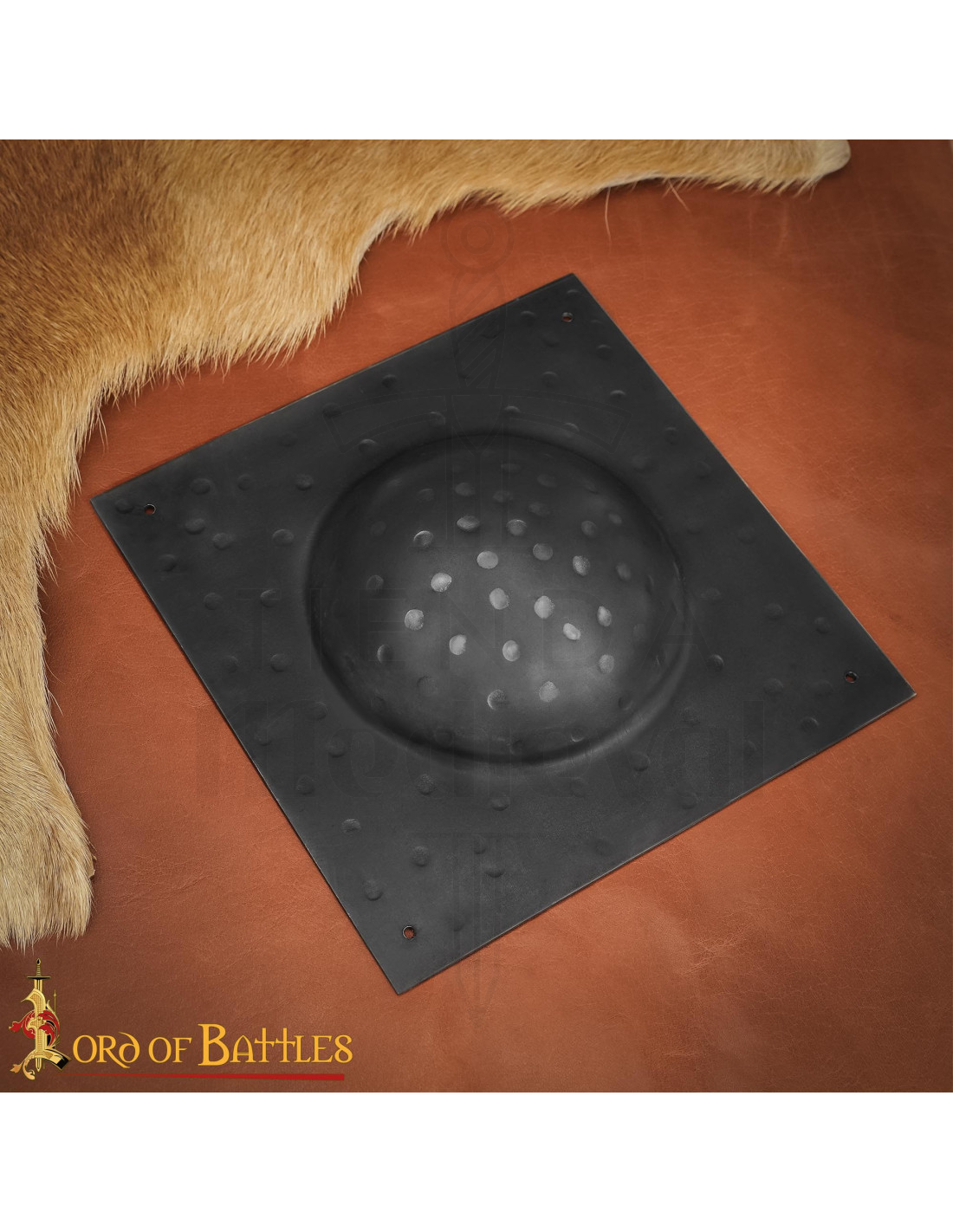 De centrale koepel, met kleine uitsteeksels harmonieus verdeeld, biedt niet alleen een authentieke en bewerkte uitstraling, maar vergemakkelijkt ook een veilige grip en gecontroleerd impactpunt tijdens recreaties. De vierkante basis met gaten in de hoeken zorgt voor een nette en evenwichtige montage, voorkomt afwijkingen en zorgt ervoor dat je schild zijn vorm en beweging behoudt tijdens actie.