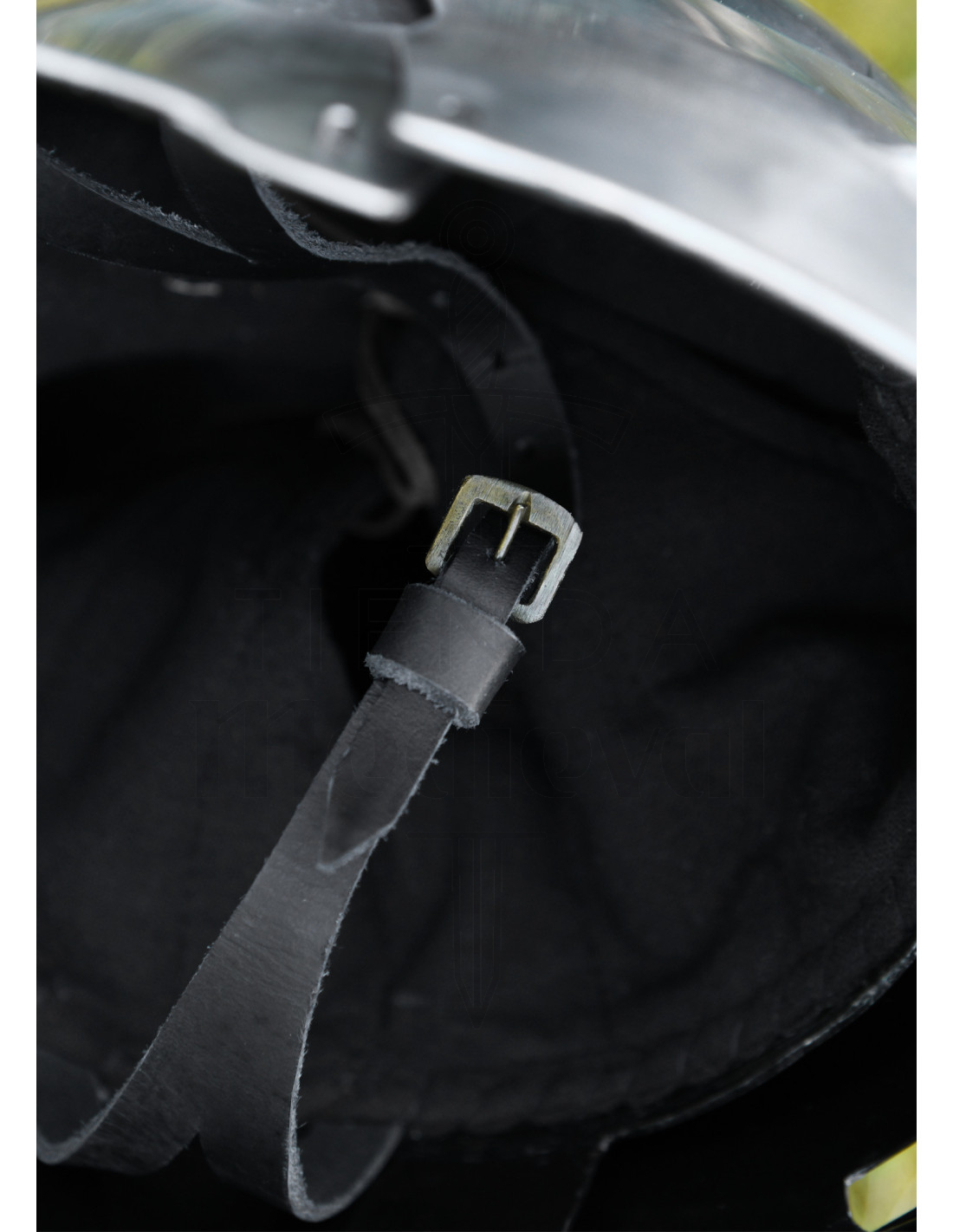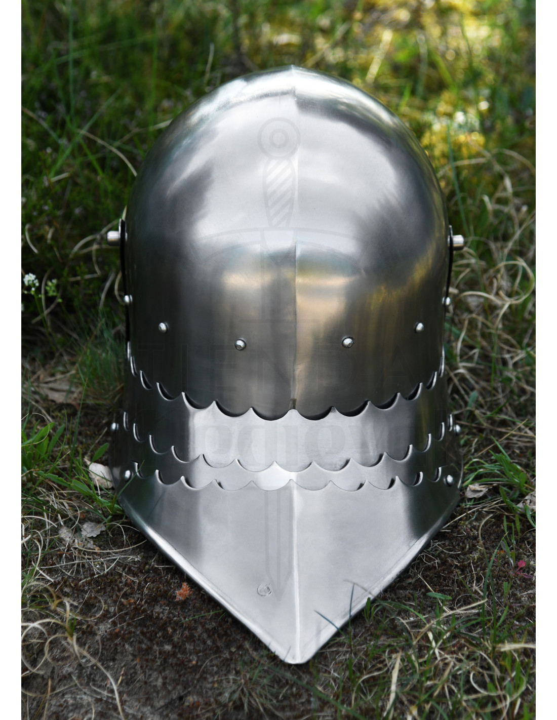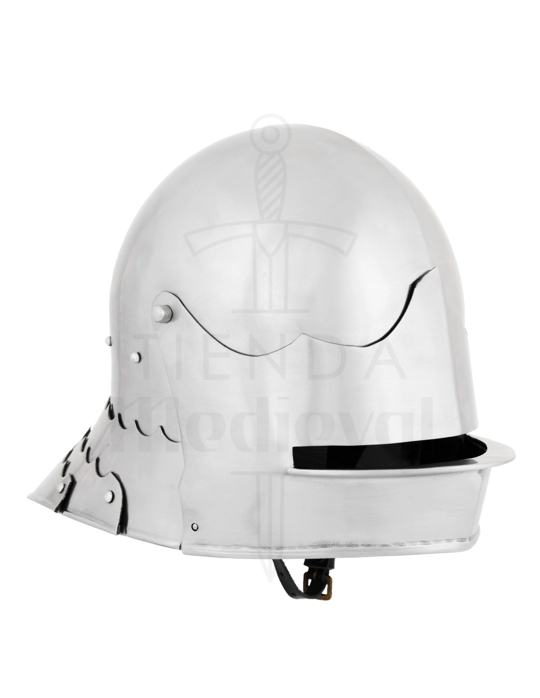 Neem geen genoegen met imitaties van lage kwaliteit, dit functionele 1480 Gothic Headpiece is een waar kunstwerk. De fabricage in 2 mm staal. dik maakt het een resistent en betrouwbaar stuk, dat u de nodige bescherming biedt zonder uw mobiliteit in gevaar te brengen. Bovendien zorgt het vizier met een pin en kinriem ervoor dat het perfect op uw hoofd past en voorkomt dat het tijdens de actie verschuift.