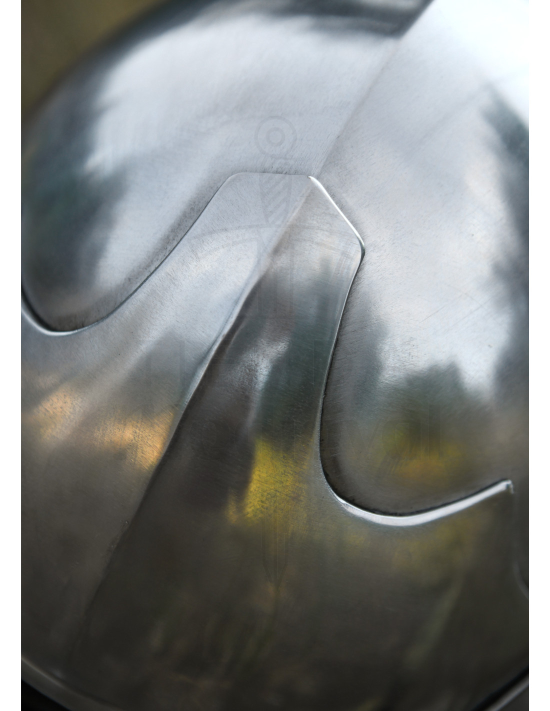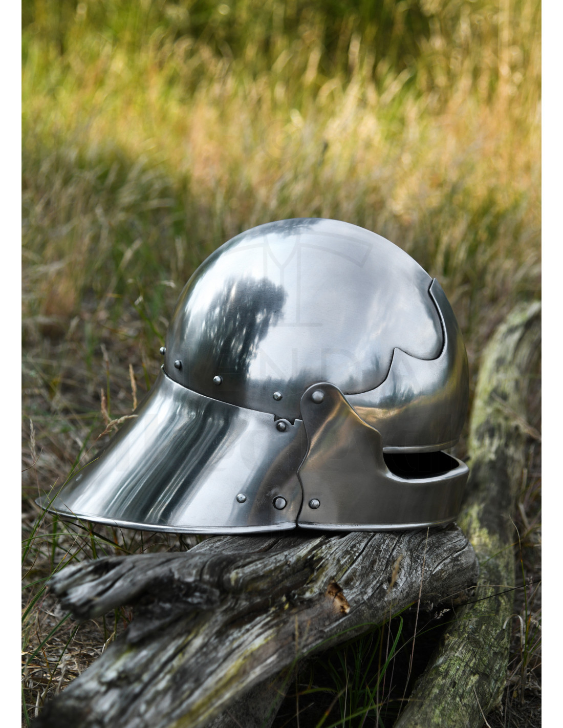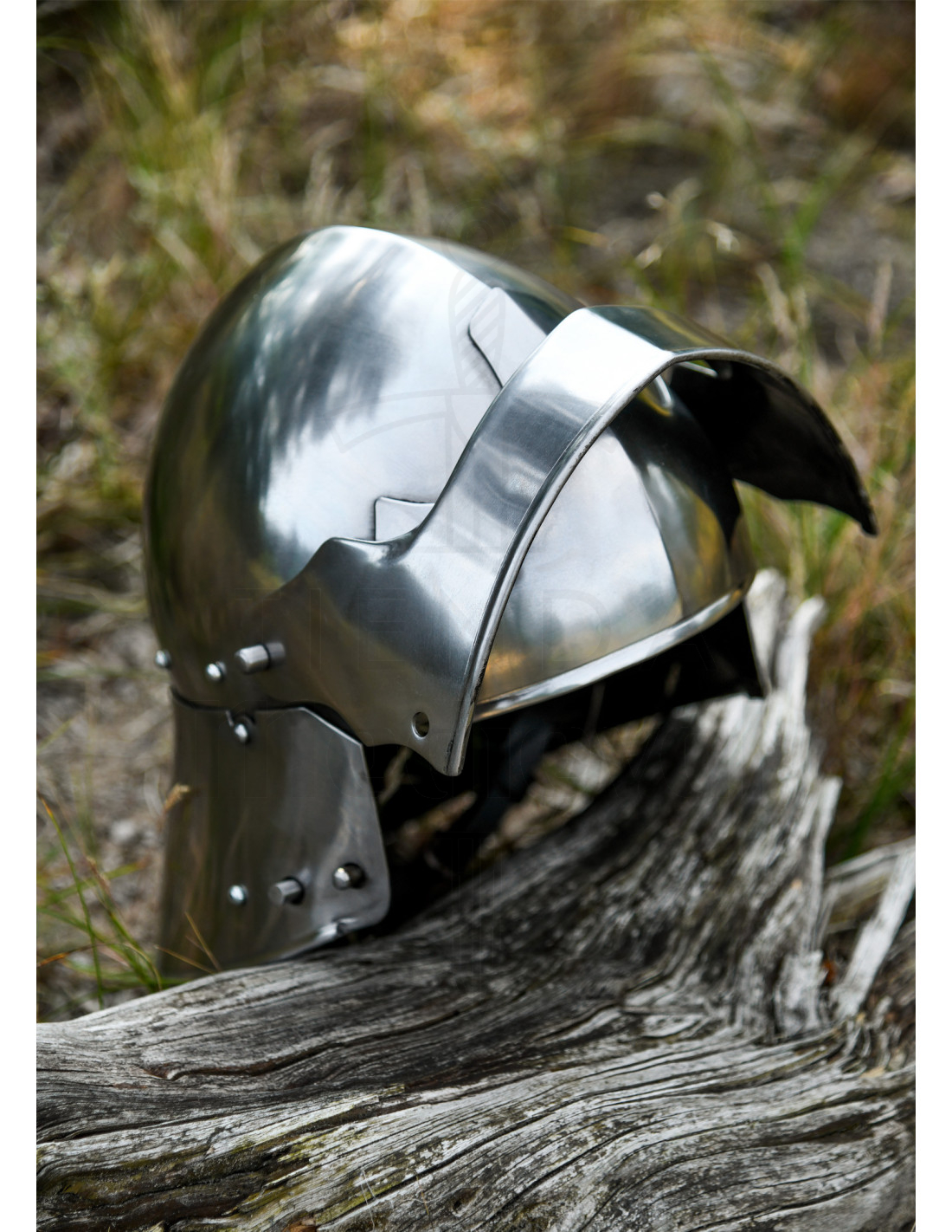 Het functionele Duitse hoofddeksel jaar 1480 heeft een verstelbaar vizier waarmee je je gezicht kunt beschermen tijdens gevechten. Bovendien bevat het een kinriem om het stevig op je hoofd te bevestigen.