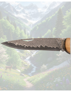 De handgreep van licht hout biedt een comfortabele en natuurlijke grip, ontworpen om zich aan de hand aan te passen en het vasthouden te vergemakkelijken, zelfs tijdens herhaaldelijk gebruik. De zichtbare metalen klinknagels en de schroef van het pivotelement stralen stevigheid en betrouwbaarheid uit in het mechanisme, en maken bovendien een soepele opening mogelijk dankzij de praktische groef in het lemmet.