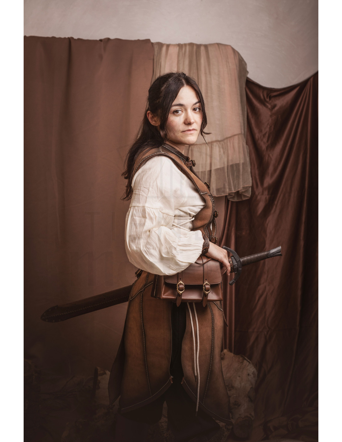Ben je op zoek naar een kledingstuk dat elegantie combineert met kracht? Deze ruime en verfijnde 'Lange middeleeuwse leren jas van suède' voor vrouwen is precies wat je nodig hebt. Gemaakt van hoogwaardig suède, biedt het een zachte en duurzame textuur, perfect om de gevechtsdagen door te komen of te dragen bij historische evenementen of recreaties. Bovendien zorgen de leren versterkingen in de kraag, mouwen, zoom en voorzijde voor extra duurzaamheid en een onderscheidende uitstraling die niet onopgemerkt blijft.