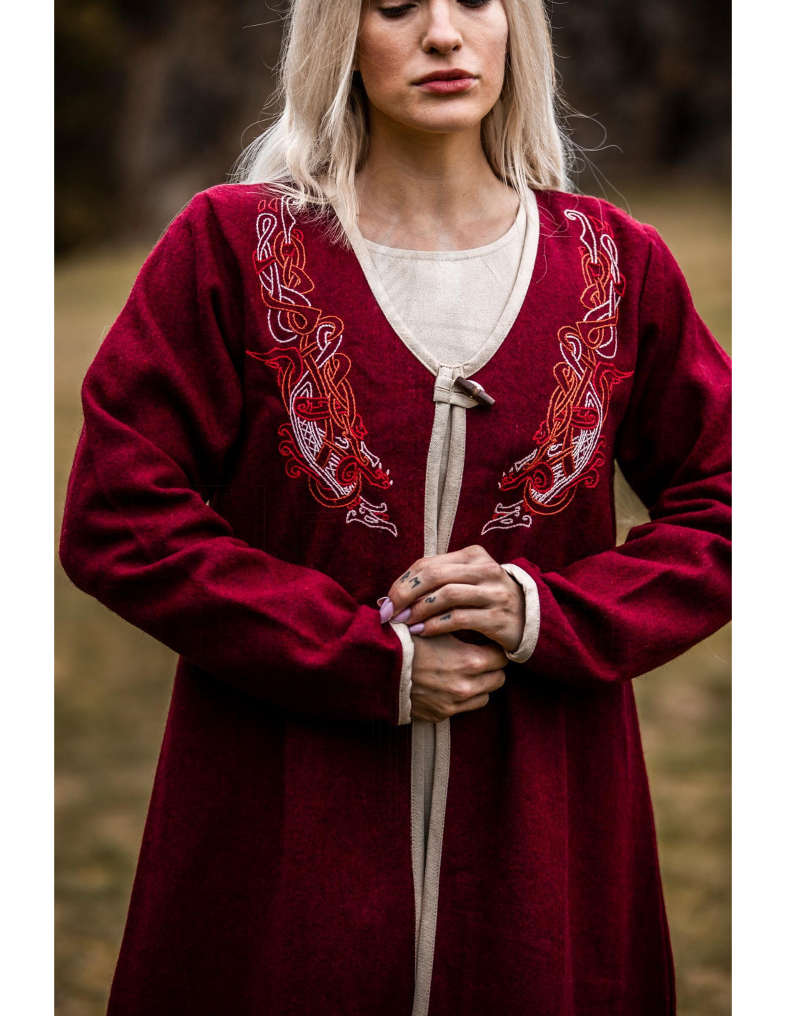 De Vikingische damescape Birka Skadi, in rode kleur, biedt die onmiddellijke impact dankzij de lange en vloeiende snit die elke stap begeleidt en een elegante silhouet creëert zonder je bewegingen te beperken. De houten knopen aan de voorkant geven een rustieke en praktische uitstraling, gemakkelijk te sluiten zelfs met handschoenen, terwijl de contrasterende rand en de borduursels op de borst persoonlijkheid en onderscheidendheid toevoegen die spreken van traditie en smaak.