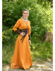 Ontdek de charme van Vikingmode met de Vikingjurk voor dames model Milla in een levendige mosterdgele kleur! Deze jurk heeft een losse snit en is gemaakt van een lichte stof van 100% katoen, de perfecte keuze voor elke geschiedenisliefhebber die de elegantie van de vroege middeleeuwen wil recreëren.