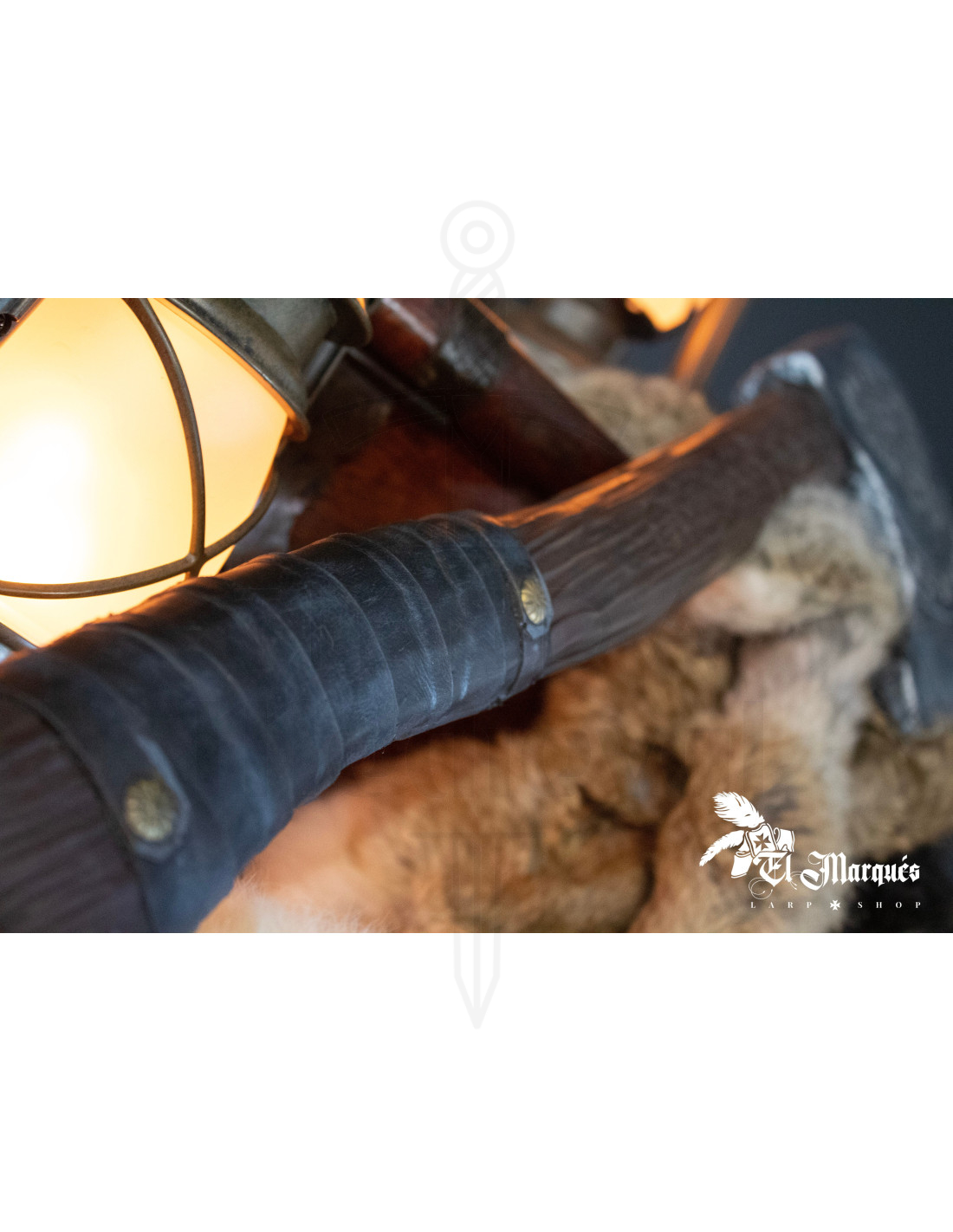 De kop van het wapen toont smederijeffecten, bewerkte sneden en een decoratie met Noorse runen en een wolf tussen Vikingknoopjes, details die de persoonlijke vertelling van je personage versterken en de aandacht trekken op beurzen, LARP-evenementen en fotosessies. Een keuze die is bedacht voor wie visueel impact en thematische consistentie in elke scène zoekt.