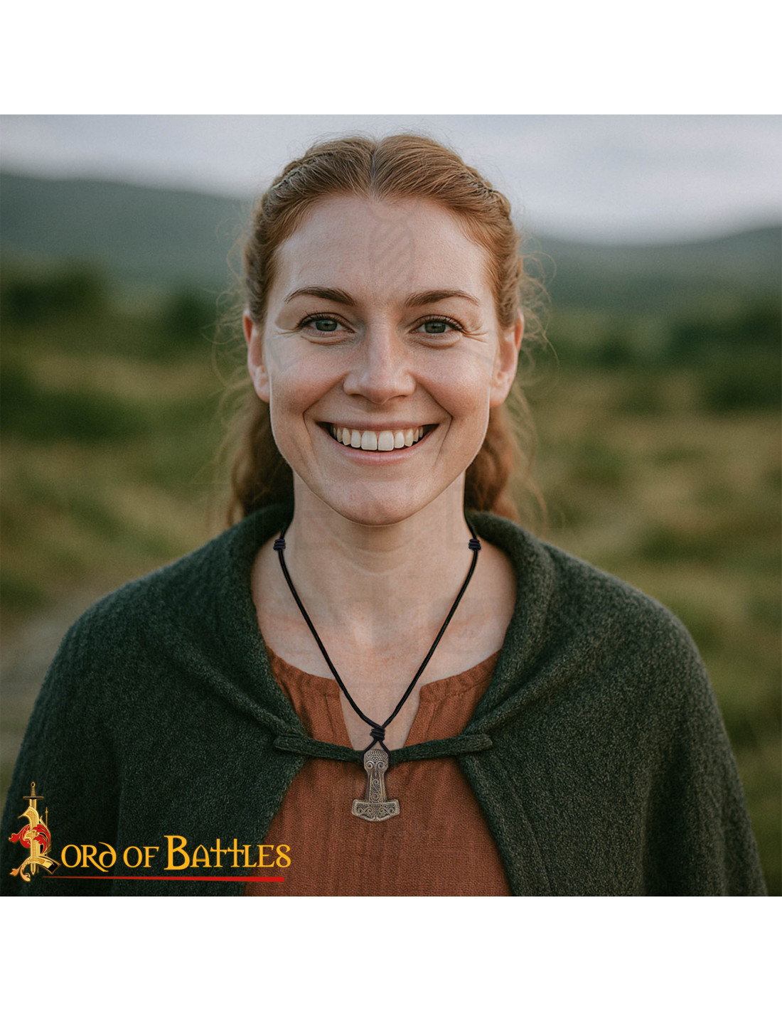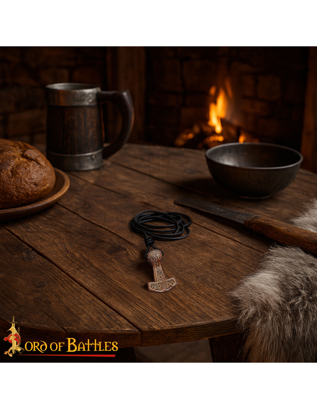 Deze getrouwe reproductie van Thor's hamer vangt de rijkdom van Noorse motieven, met verweven patronen en reliëfstructuren die de blik trekken en uitnodigen om aangeraakt te worden, waardoor een unieke aanwezigheid ontstaat die zowel met alledaagse kleding als met geïnspireerde Viking-stijlen opvalt.